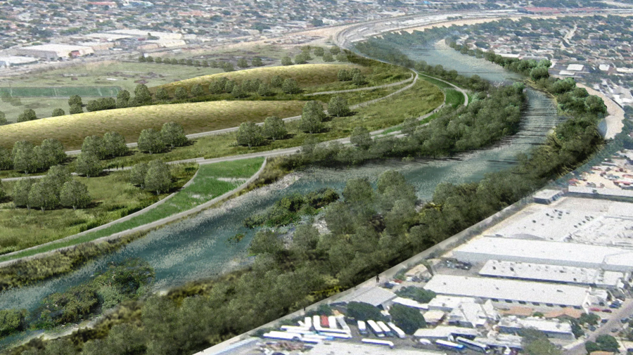 Главной проблемой стал жёстко бетонированный канал, появившийся после катастрофических наводнений, который полностью лишил реку природных свойств и доступности для жителей. Проект предложил экологическое восстановление: частичную дебетонизацию, создание террас, расширение поймы, формирование зон задержки воды, внедрение очистных ландшафтных систем. Эти решения позволили улучшить водный баланс, снизить риск паводков и вернуть реке живой природный характер.