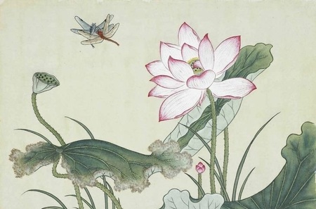 Ким Хондо «Лотос и стрекозы», XIX век, бумага. Лу Ифэя, выполненные тушью и красками на бумаге.