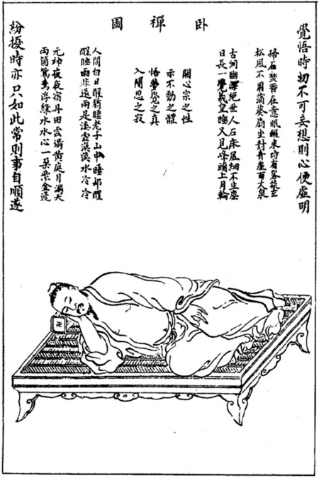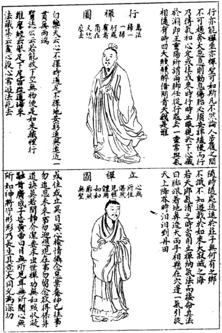 1. Медитация лёжа 卧禪圖, 1615 Синьмин гуйчжи. 2. Медитация в движении и стоя 行禪圖, 立禪圖, 1615 Синьмин гуйчжи.