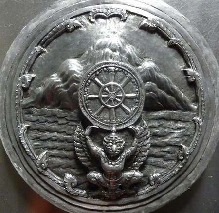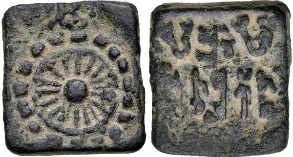 1. Монета Таксилы с изображением Колеса Дхармы и буддийских символов. 2. Печать провинции Чайнат (гаруда, держащий дхаммачакку на фоне горы и реки), Ват Шри Супх.