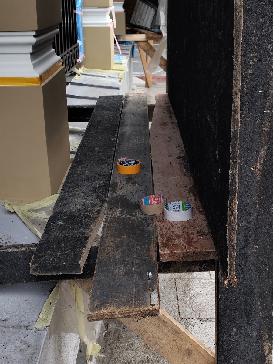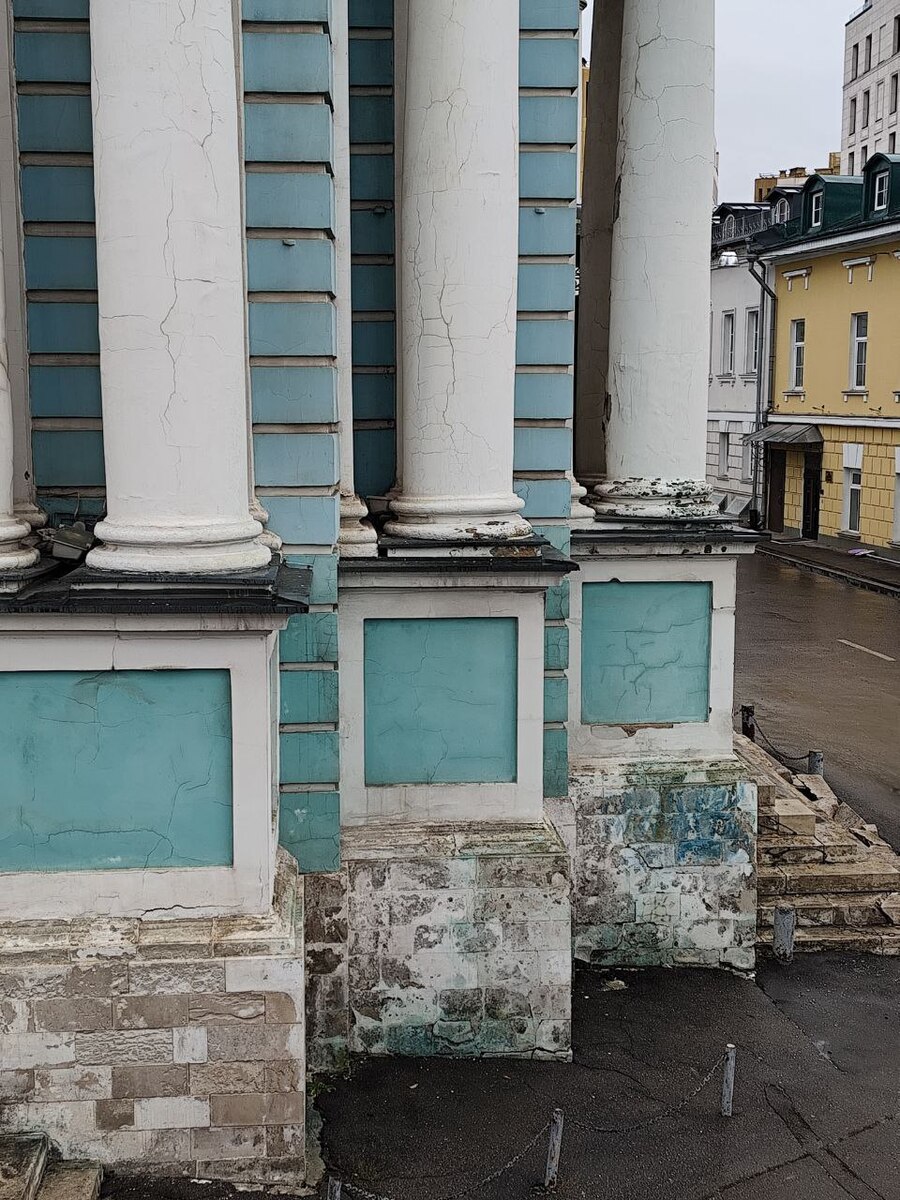 Трещины, осыпающаяся штукатурка, строительные сетки, залатанные участки тротуаров и красно-жёлтые сигнальные ленты фиксируют непрерывный процесс «чинят-перечиняют», задавая ритм острых графичных линий среди исторической ткани.