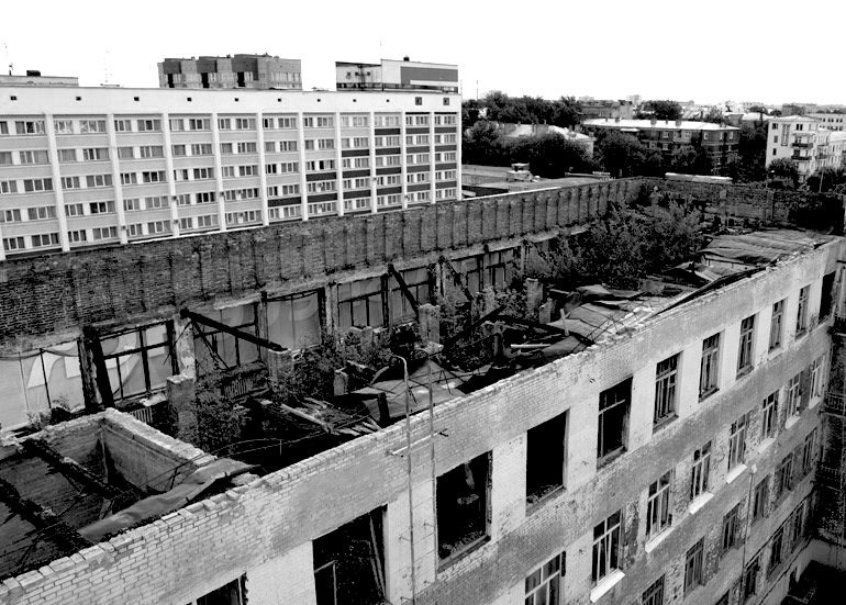 Общая площадь здания — 9,7 тыс. кв. м. Состояние руинированое, вызвано крупным пожаром, произошедшим вечером 21 января 2008 года. Серьёзно повреждены четвёртый и чердачный этажи, выгорела часть третьего этажа, нижние — были залиты водой. Перекрытия обрушены. Разрушения коснулись и стен силового каркаса здания, сохранен лишь остов наружных стен. Использованные материалы при строительстве — кирпич, железобетон; облицован штукатуркой серо-белого цвета, имитирующей текстуру бетона.