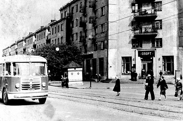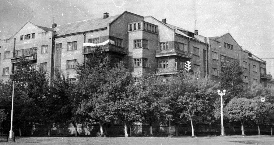 Слева: 100-квартирный «Дом специалистов», ул. Калинина, 17; Арх. Н. Кадников, 1932–1934 гг. Справа: Четырёхэтажный 72-квартирный жилой дом фабрики НИМ. Арх. Н. Кадников, 1950 г