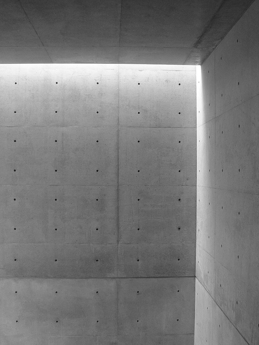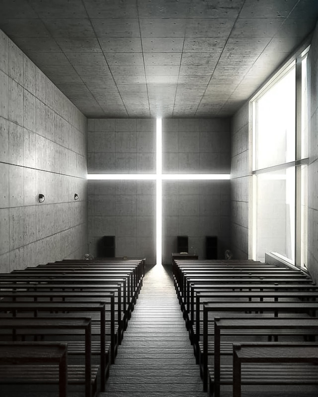 Так суть управления светом в Церкви Света Тадао Андо заключается в абсолютном минимализме, где свет становится единственным архитектурным и духовным элементом. Архитектор использует резкий контраст между плоским объемом темного бетона и ярким светом. Темный интерьер служит «холстом», на котором единственный источник света — крестообразный проем в стене алтаря — создает драматический и ослепительный световой символ. Этот проем действует как сквозное отверстие, а не как обычное окно, направляя все внимание прихожан к алтарю и превращая архитектуру в полноценное представление.