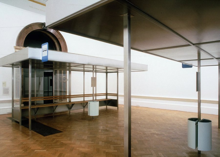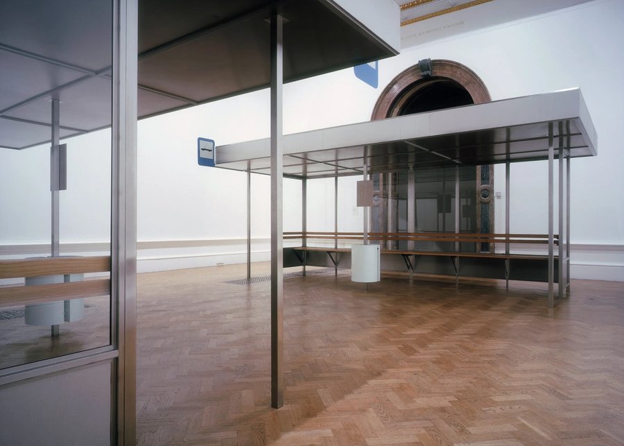 Проект Даррена Алмонда представляет собой две полноразмерные реплики автобусных остановок 1950‑х годов из польского Освенцима, выполненные из металла, стекла и дерева и выставленные в галерейном пространстве. В пространстве белого куба они выглядят как минималистичные, чистые структуры, но знание их происхождения делает их болезненным напоминанием об ужасах войны9.