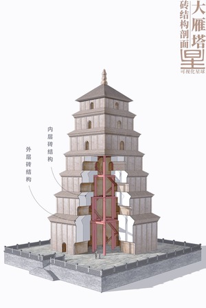 1. Реконструированные ворота Даньфэн, в которых сохранились руины оригинальных ворот дворца Дамин. 2. Конструкция стен и внутреннего каркаса пагоды.