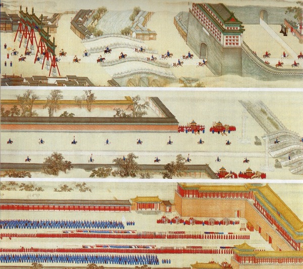 1. Запретный город, как он изображён на рисунке эпохи династии Мин. 2. Император Канси возвращается в Запретный город после поездки на юг.