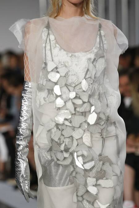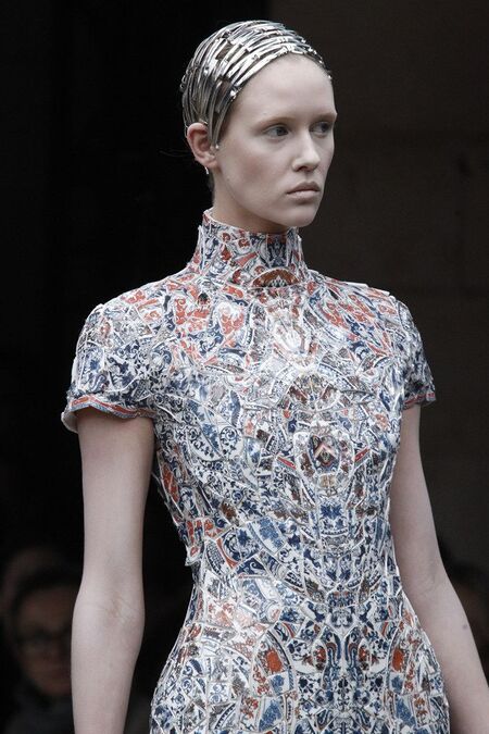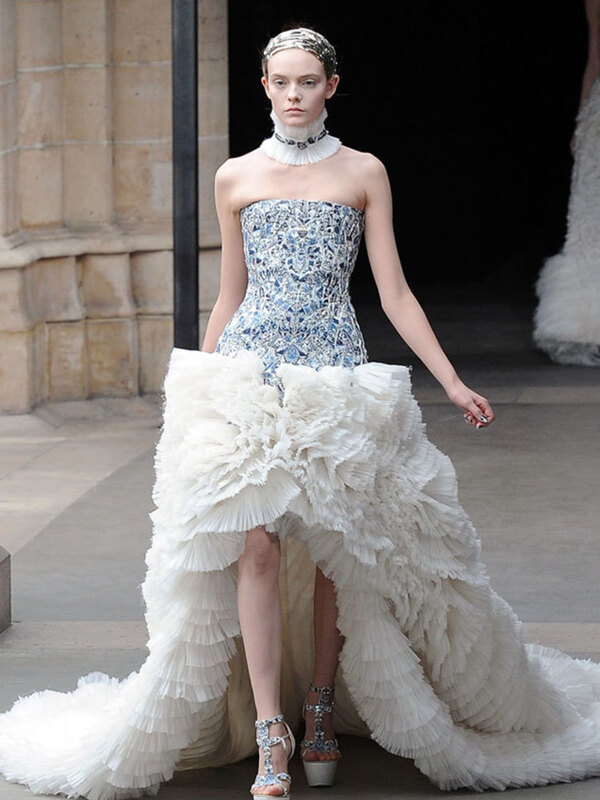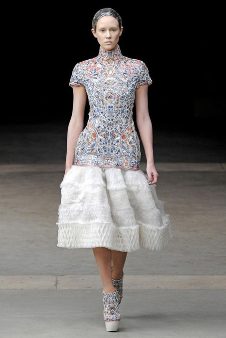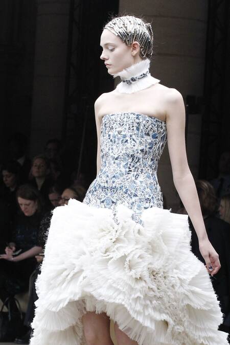 Одним из самых запоминающихся элементов коллекции Alexander McQueen SS 2011 стали платья с верхом из битого фарфора. Это не просто принт или имитация, а реальный коллаж из осколков фарфора, собранных и нашитых на белую кожу. Платье переходит от жёсткого, мозаичного верха к пышному подолу из органзы, создавая эффект «взрыва» или тающего льда, что идеально вписывается в тему коллекции «Ледяная королева и ее двор». Оно символизирует хрупкость красоты, как разбитый лёд или фарфор, и добавляет мотив сюрреализма.