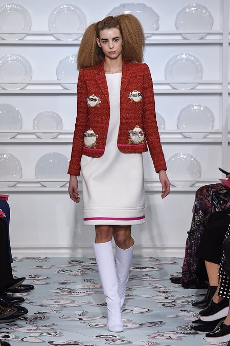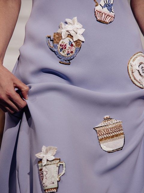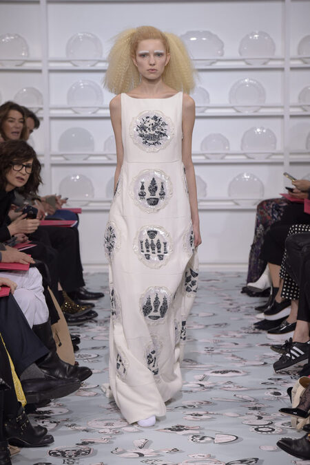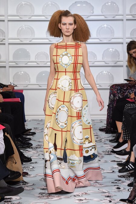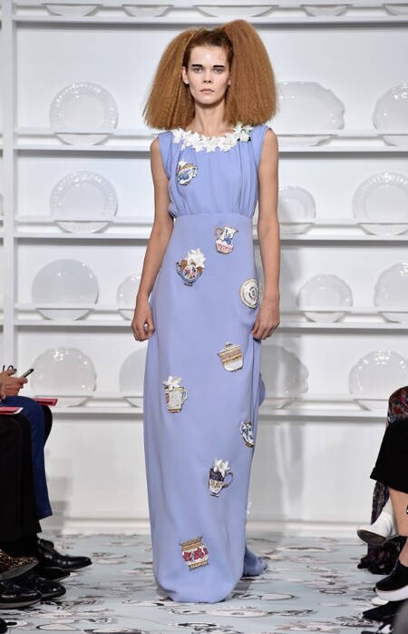 Schiaparelli Haute Couture SS 2016 Коллекция, вдохновлённая темой еды и стола, выражает мотив посуды через принты с тарелками, чашками и столовыми приборами на платьях, а также вышивки овощей и фруктов; ключевая идея — сюрреалистический оммаж архивам Эльзы Скиапарелли, где повседневные объекты превращаются в whimsical couture.