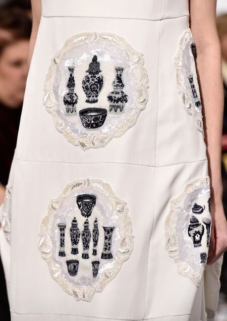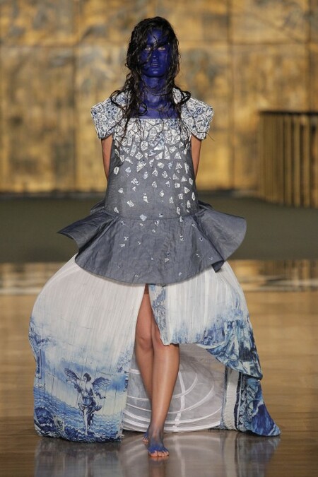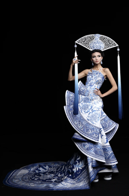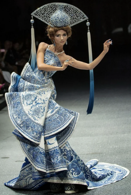 Guo Pei, «One Thousand and Two Nights» (2010) В коллекциях Guo Pei, таких как «One Thousand and Two Nights» (2010), платья собраны из «осколков» ткани, имитирующих фарфоровые фрагменты с сине-белыми узорами, символизируя красоту в разрушенном мире и культурную гибридность. Головной убор напоминает вазу, а ткань имитирует трещины на глазури. Это прямые отсылки к императорскому китайскому фарфору династий Мин и Цин.