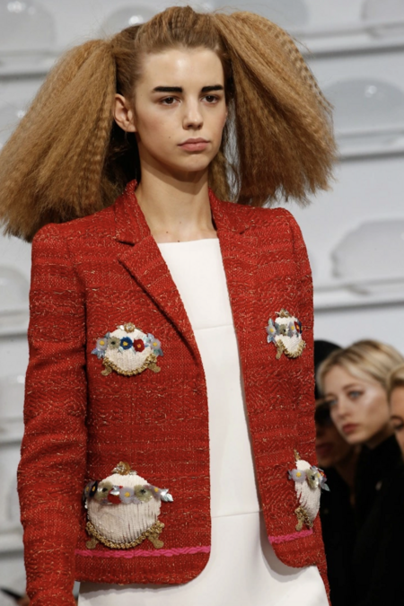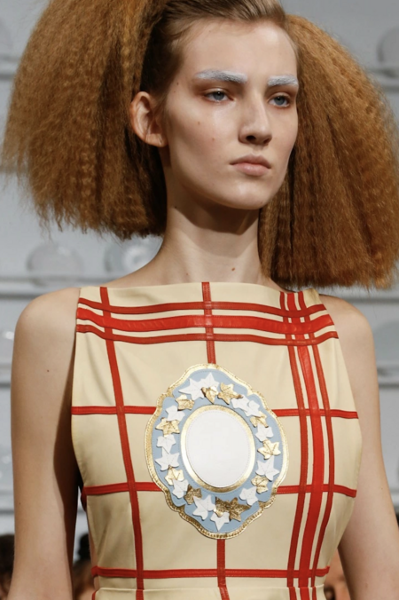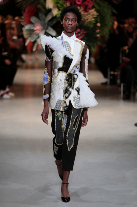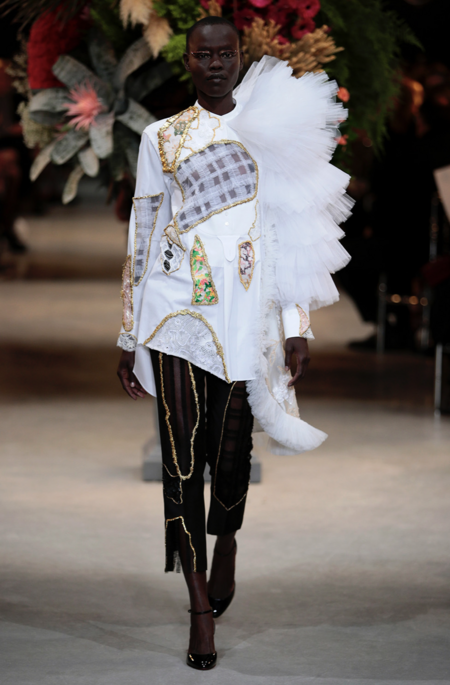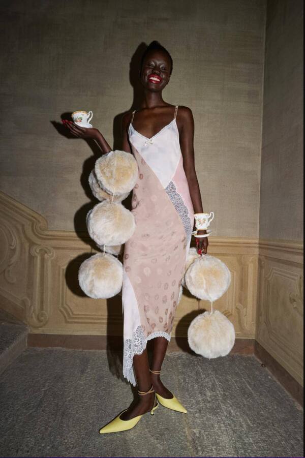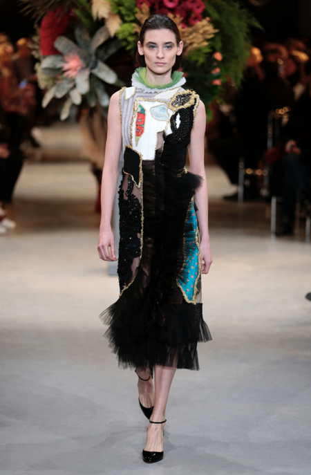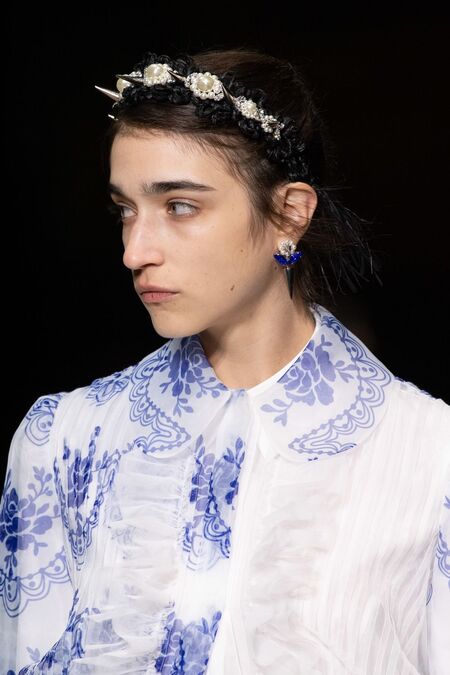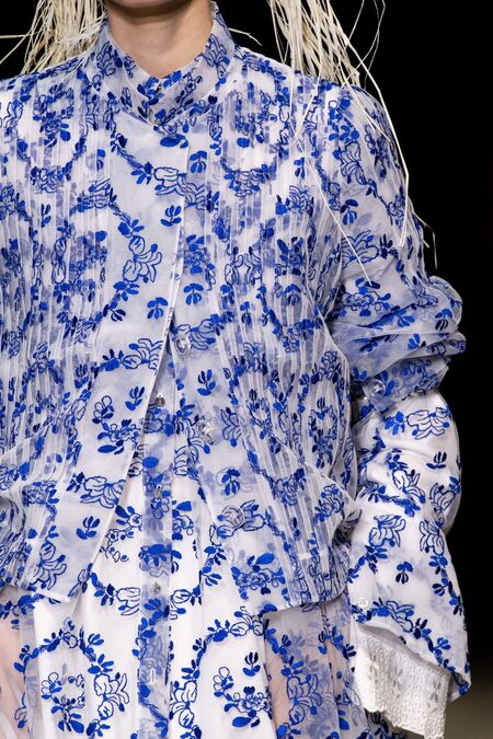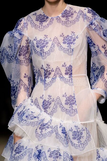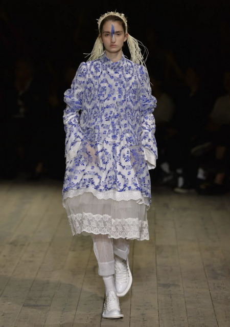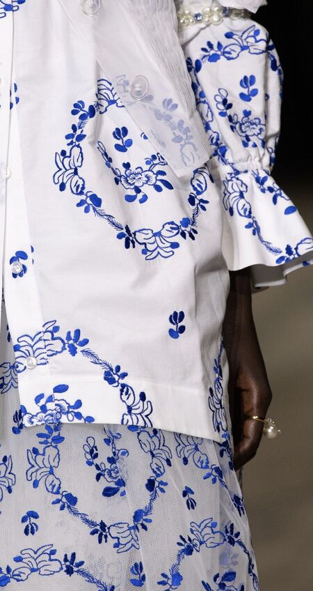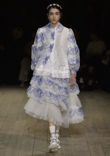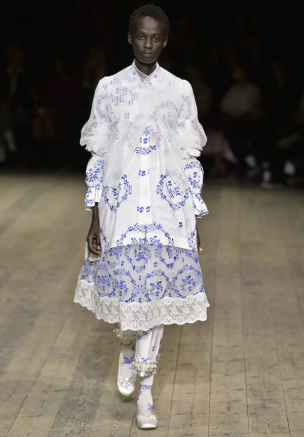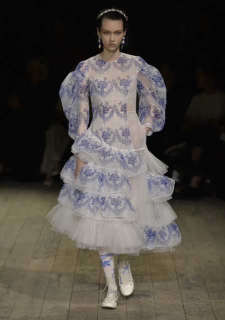 Использование мотивов фарфоровой голубой росписи в коллекции Simone Rocha SS 2020 Коллекция, вдохновлённая ирландским фольклором Wren Boys, включает мотивы сине-белой фарфоровой росписи (Delft) на платьях с рюшами и принтами, символизируя домашний уют и хрупкость.