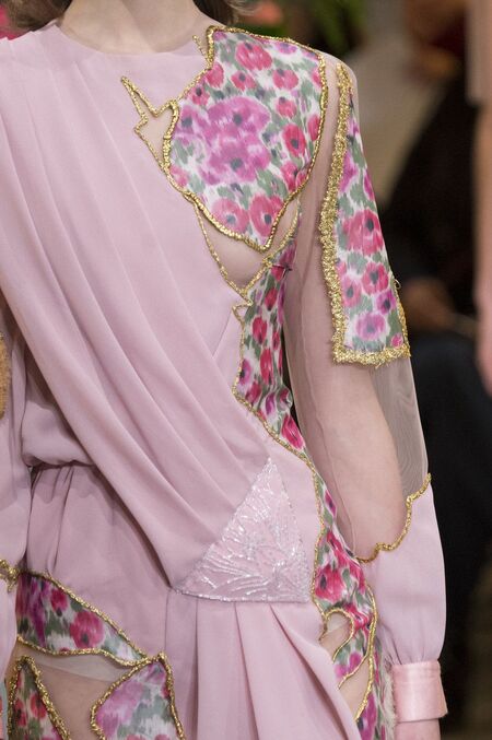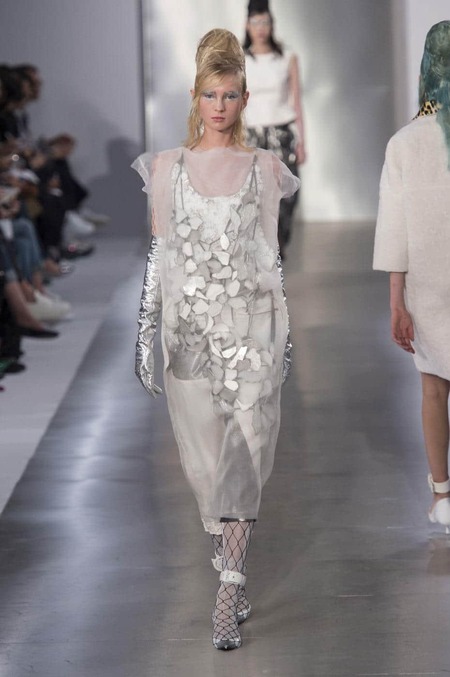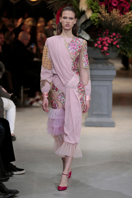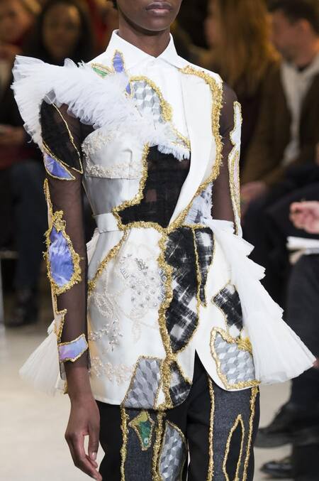 Viktor & Rolf 2017 Коллекция SS 2017 использует образы осколков фарфора в технике кинцуги (ремонт золотом), где фрагменты ткани формируют асимметричные платья из переработанных материалов, символизируя красоту в несовершенстве и устойчивость.