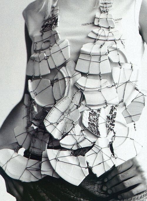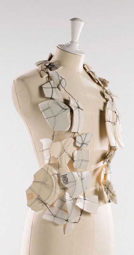Porcelain Vest Maison Margiela FW 1989 Этот жилет из первой Artisanal коллекции Мартина Маржелы собран из осколков фарфора, скреплённых проволокой на хлопковой основе, символизируя нарратив разрушения и перерождения, где бесполезные фрагменты превращаются в носимую скульптуру, подчёркивая темы хрупкости и апсайкла.