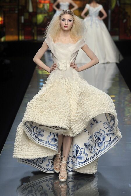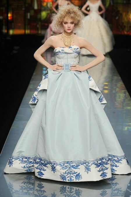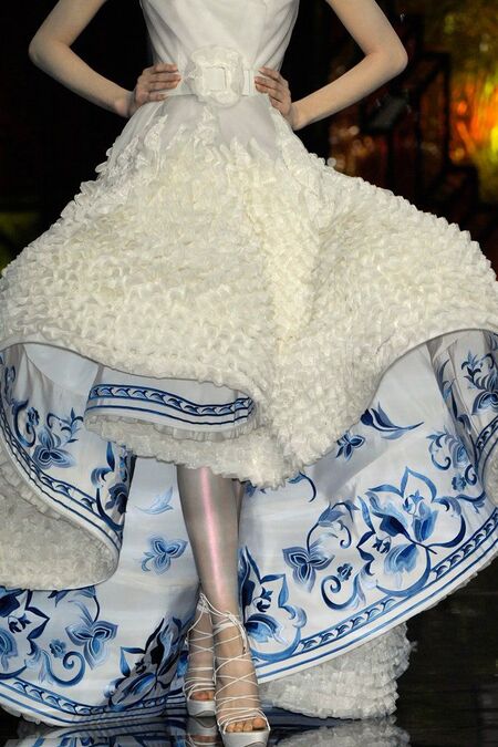 Christian Dior SS 2009 Couture В коллекции Джона Гальяно платья украшены декором и принтами, имитирующими синюю роспись на фарфоре (вдохновлено дельфтской керамикой), с цветочными мотивами и тюльпанами на белом фоне, подчёркивая голландские и фламандские влияния в контексте роскоши couture.
