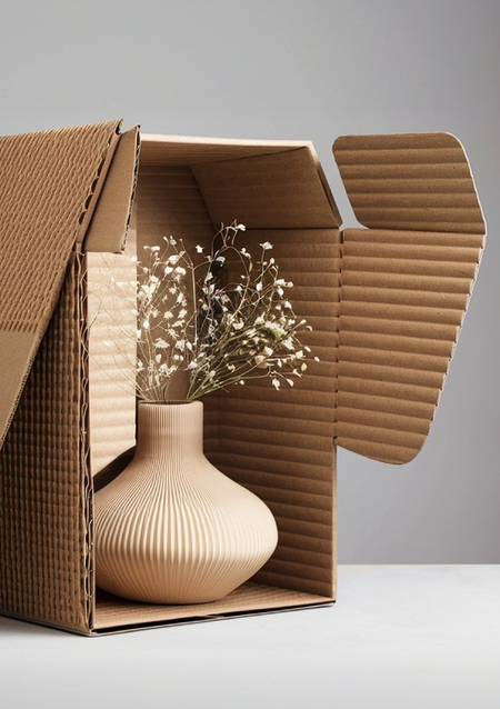 The image showcases a tall, slender cardboard box with a unique textured design. It’s branded as «Vasotele» and appears to be packaging for a vase, as indicated by the label. The box is open at the top, revealing the corrugated cardboard interior. The overall aesthetic is minimalist and modern, with a focus on sustainability due to the use of cardboard. The neutral color palette and simple design elements create a sense of elegance and sophistication.