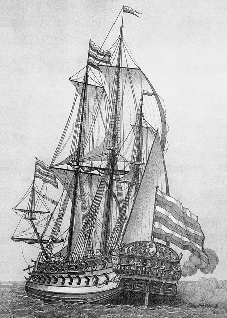 Адриан Шхонебек. Корабль «Гото Предестинация». Фрагмент гравюры. 1701