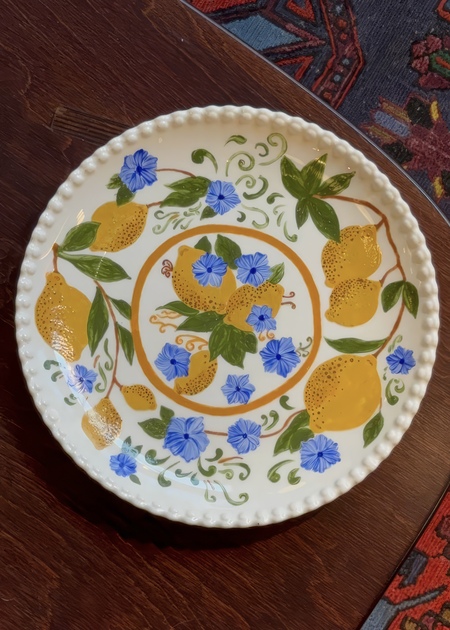 Лимоны и цветы: цитрусовая тема — один из знаковых мотивов итальянской керамики. Желтые лимоны с рельефными точками, насыщенно-зеленая листва и синие цветы напоминают о садах Амальфи и традиционной мажолике региона Капри.