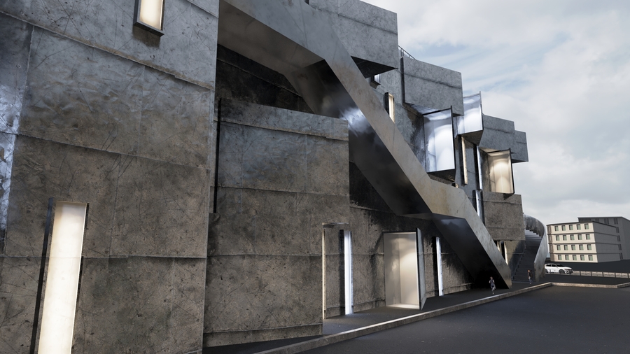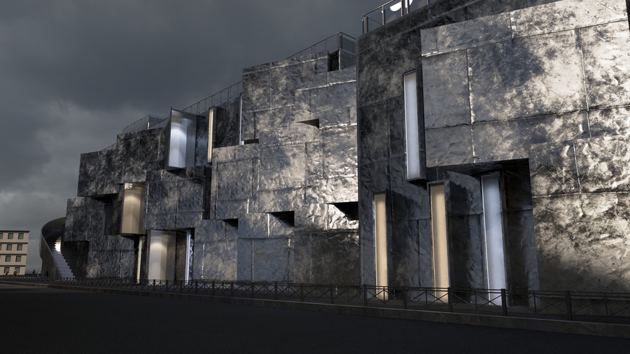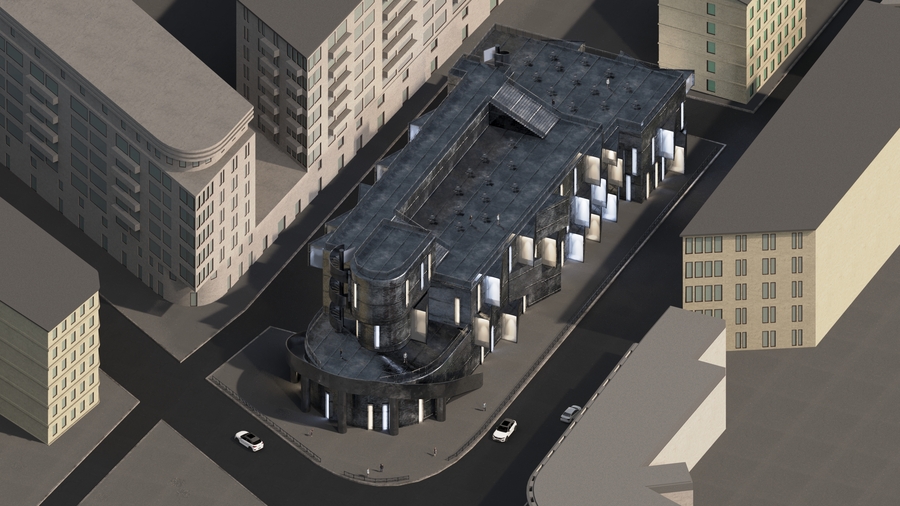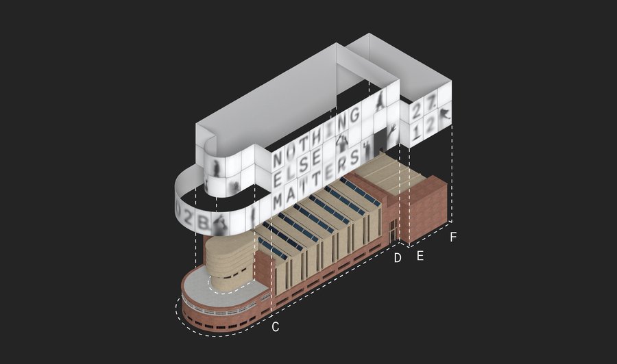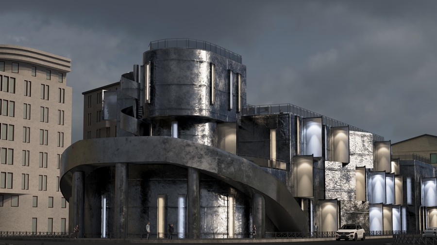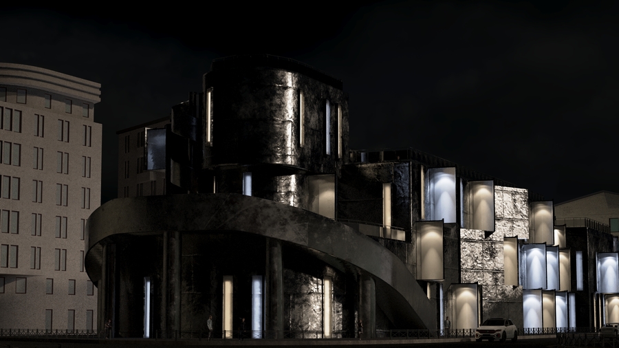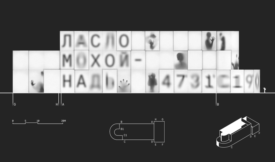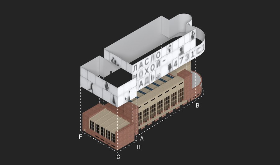 Концепция фасада: синтез инноваций Мохой-Надя и деконструктивизма. Фасад вдохновлён экспериментами Ласло Мохой-Надя, его стремлением к технологическому прогрессу и диалектикой формы — балансом между строгой геометрией и пластикой.
