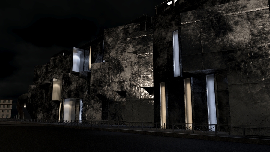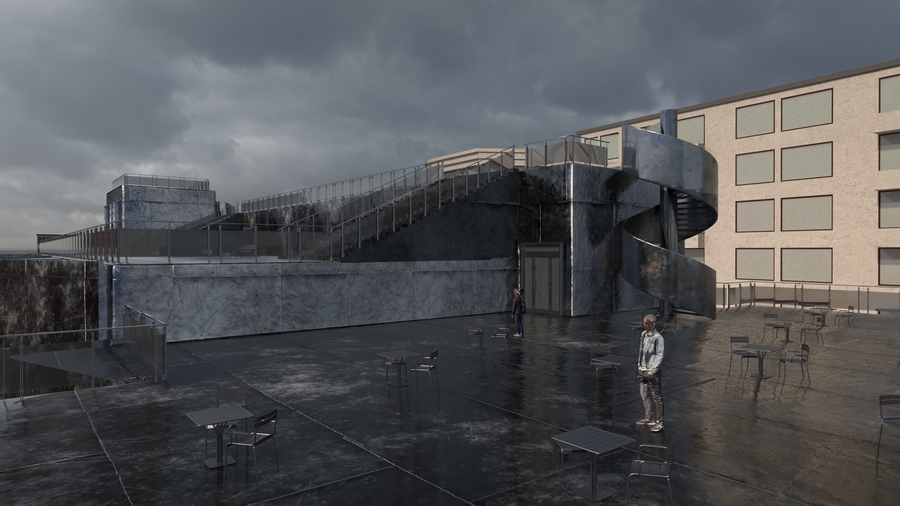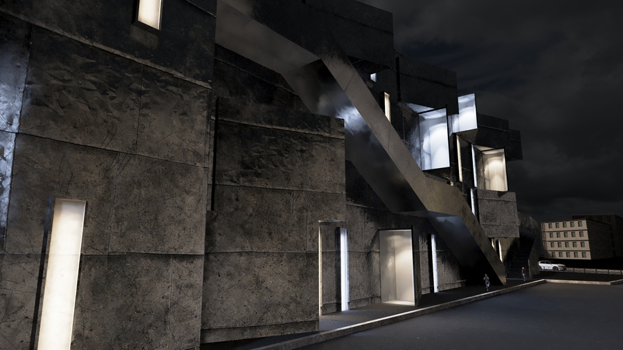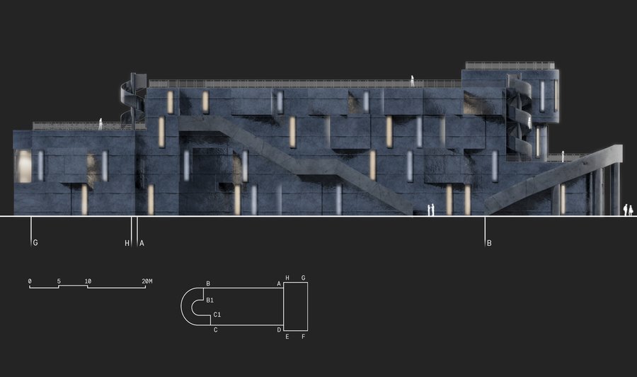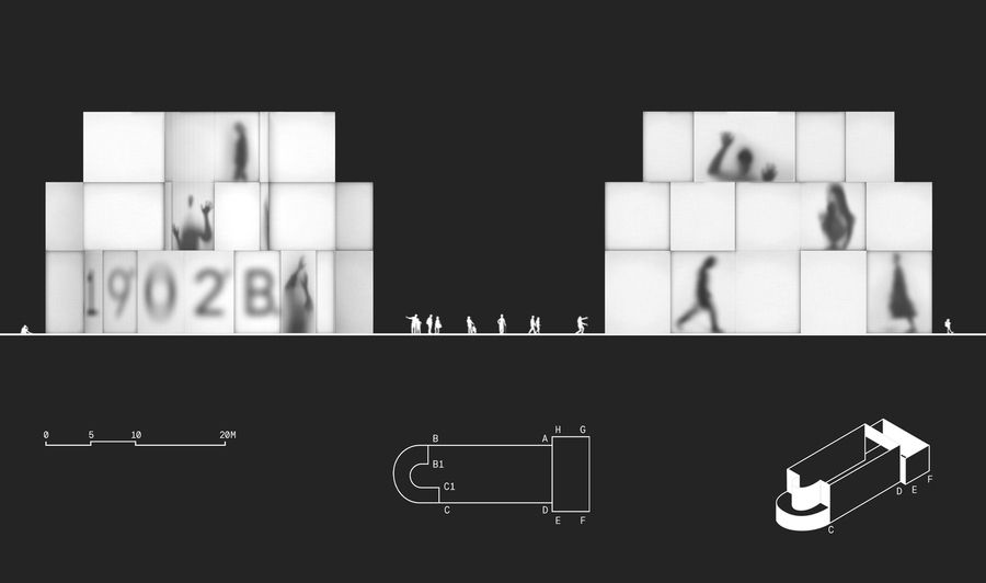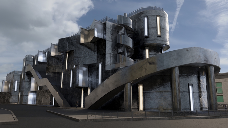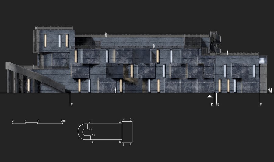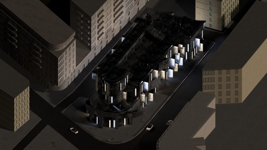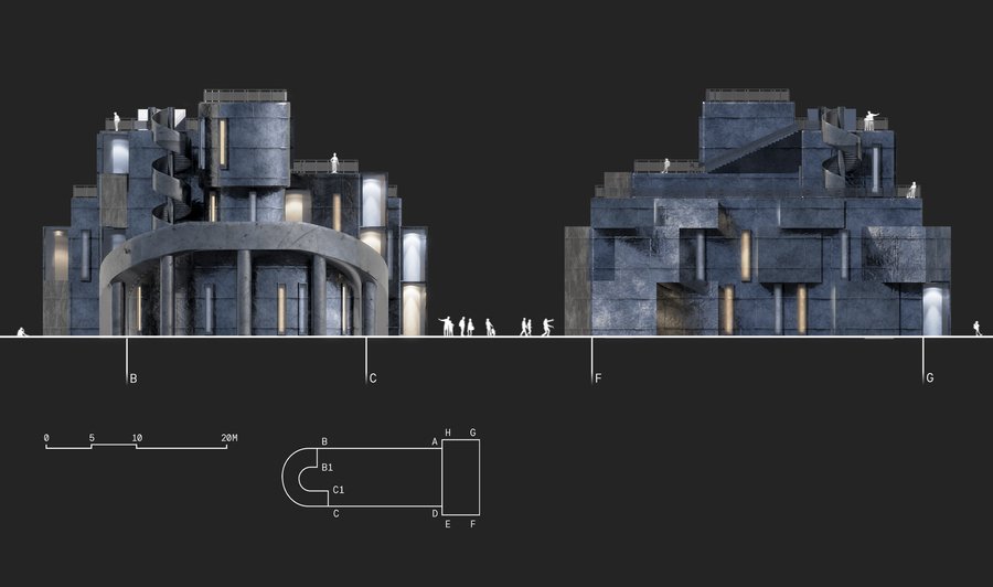 Концепция фасада: синтез инноваций Мохой-Надя и деконструктивизма. Фасад вдохновлён экспериментами Ласло Мохой-Надя, его стремлением к технологическому прогрессу и диалектикой формы — балансом между строгой геометрией и пластикой.
