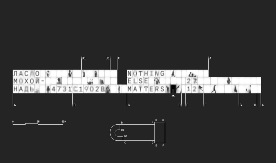 Имитация объёмных световых панелей и размытых силуэтов формирует иллюзию растворения в пространстве, подчёркивая эфемерность и изменчивость материи, что прослеживается в творчестве Ласло Мохой-Надя.
