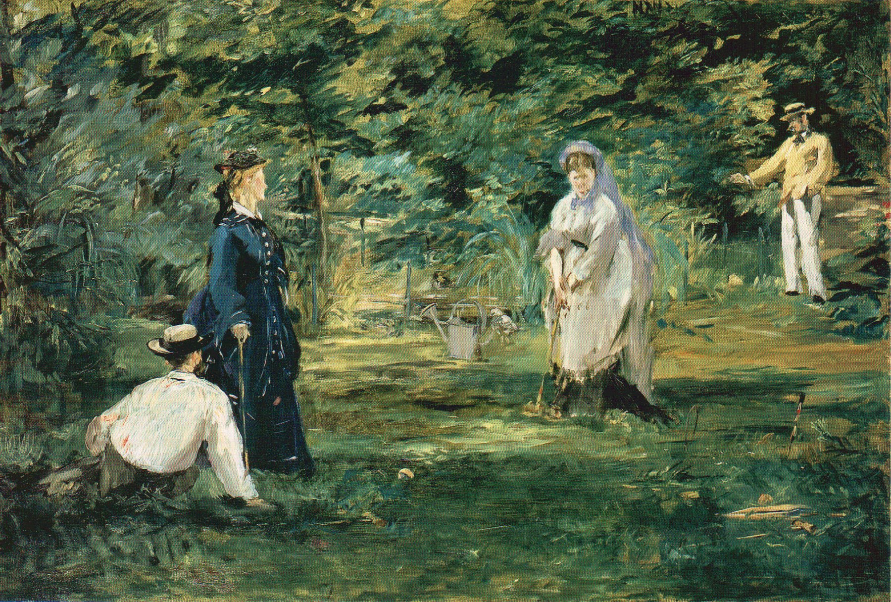 На картине «Партия в крокет» Эдуард Мане изобразил художника Альфреда Стевенса, натурщиц Викторию Мёран и Алису Лекуве и на заднем плане справа своего друга Поля Рудье. Картина написана в 1873 году, и это второе обращение Мане к теме — за два года до этого он изобразил популярную в то время игру на картине «Крокет в Булони». Ту картину приобрел импрессионист Гюстав Кайботт, а картина 1873 года была куплена другом Мане коллекционером Альбертом Хехтом. Она перешла по наследству его дочери Сюзанне Хехт Понтремоли, а позже попала в Штеделевский художественный институт во Франкфурте, где и находится ныне.