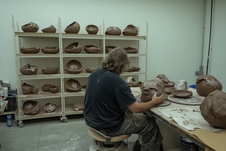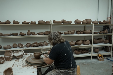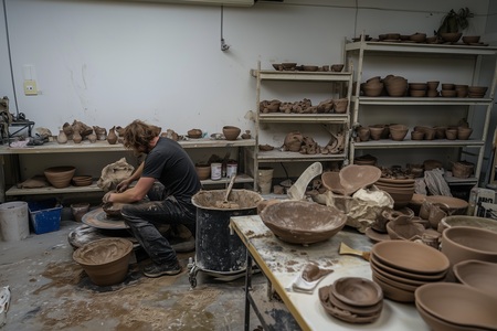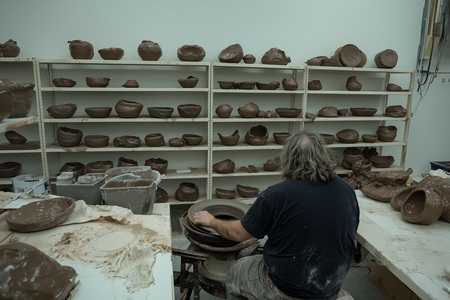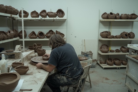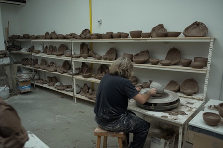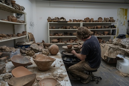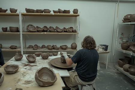 A photo of the pottery studio showing an artist at work, surrounded by various clay pieces and tools on shelves in a large room with white walls. The focus is centered around them sitting or standing near their creation area, where there’s one wheel for making pots, several different sizes of ceramic bowls, some empty bowls lying on tables and shelves, all in shades of brown and beige. (вариация изображений через vary subtle и strong)
