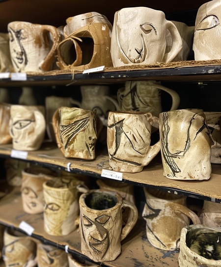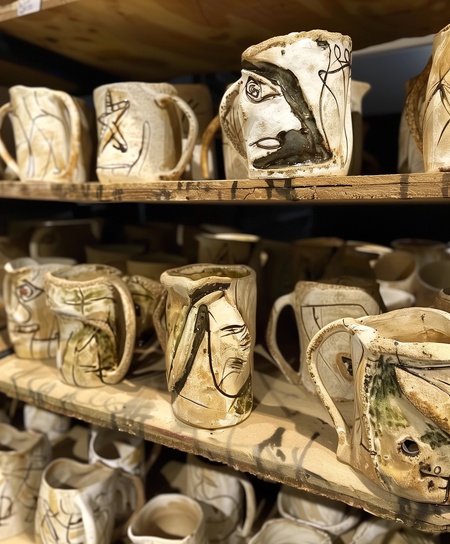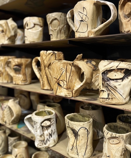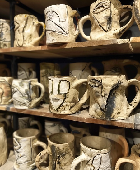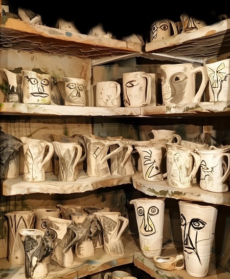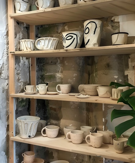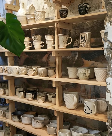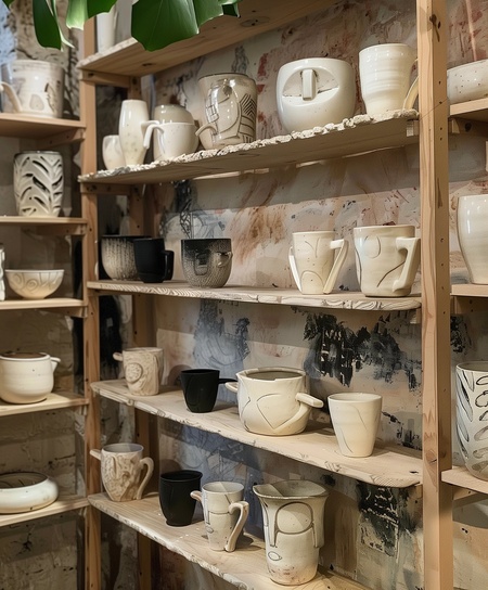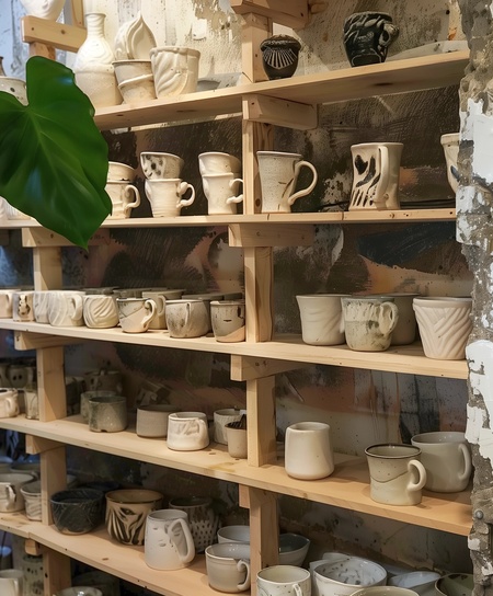 Ceramics workshop with many mugs on the shelves. The shelves are wooden and dirty. (с референсом до этого сгенерированной кружки) (vary)