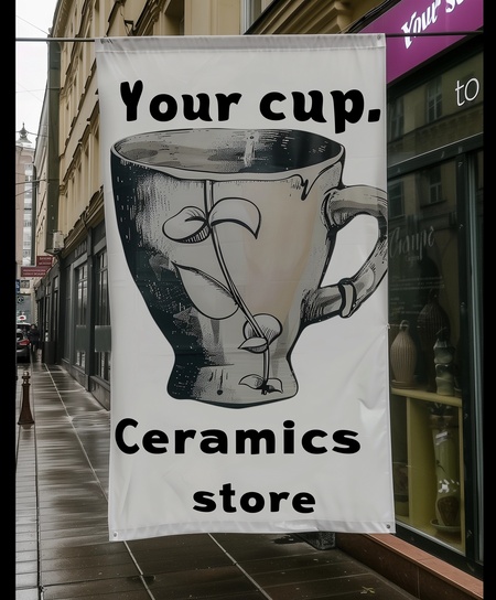 A poster for «Your cup» ceramics store on the street of Moscow, with an illustration of one ceramic mug and yellow hand-drawn leaves in gray tones, drawn by ink outlines, in watercolor style. A sign is visible at full height from which it reads «Ceramic shop», against the background there’s an urban landscape of the city, cars pass along the road. (prompt 1)