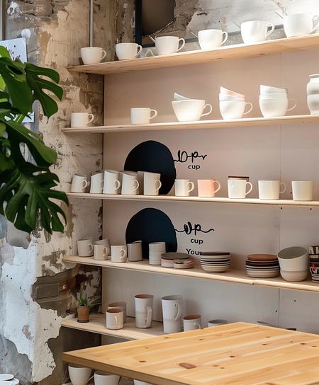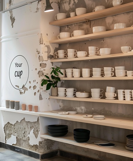 A minimalist ceramic shop, wall with wooden shelves filled with white mugs and black plates, with the text «Your Cup» written on one of them in an elegant script font. The walls have peeling wallpaper. few plants scattered around to add color and life to the space. (prompt) (вариации через vary subtle и strong) (+edit)