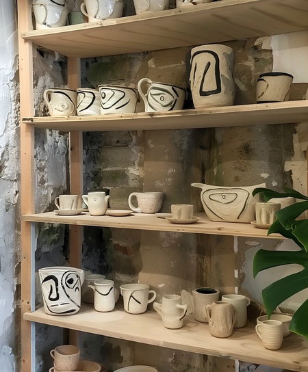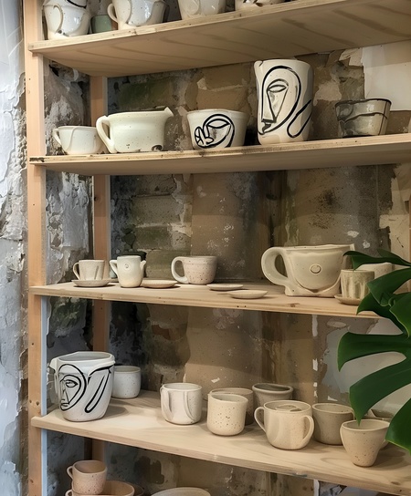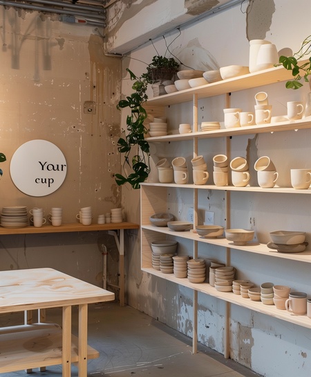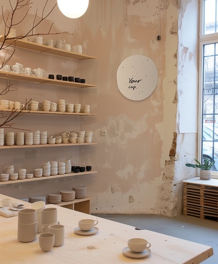 A minimalist craft store with wooden shelves filled with simple, unglazed clay mugs and plates. The wall behind is painted beige and features a large white circle sign that says «Your cup.» Plants hang from above, and there’s one empty table in front of some open double doors. (prompt) (вариации через vary subtle, strong, +edit)