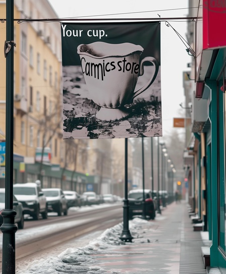 A banner on the street displays an illustration of a coffee mug with the text «Your Cup Comics Store» written in white, black, and gray colors. The banner hangs from a pole at a high height above the ground level, with a city center background featuring cars driving along the streets and snow-covered buildings in the winter season. The image is photo-realistic. (prompt 2)