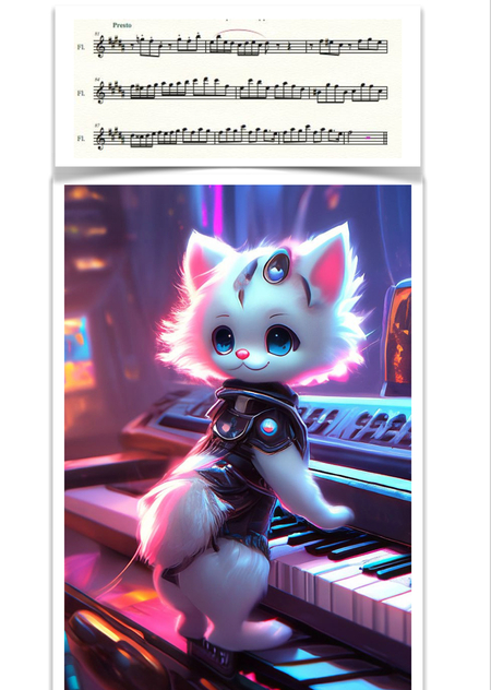 Аудиовизуальная симфония «Мяфф» — экспериментальное сочинение для флейты, MIDI-клавиатуры и электронного оркестра, созданное из аудио-идентичностей пяти кошек на стыке музыкальных традиций барокко, классицизма, раннего романтизма, рока и постмодернизма. Визуализация нарратива выполнена в нейросетях Шедеврум (визуал генерализованного образа «Мяфф») и Genmo (мультипликационное повествование о событиях из жизни пяти кошек — Моисея, Ронни, Малены, Фортуны и Шер, чьи портреты были загружены в нейросеть для генерации мультипликационных сюжетов).