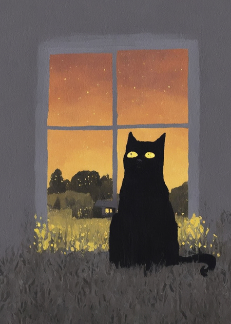 Промпт 2: «illustration in PROJ style, The roofs of St. Petersburg, on which a very small black cat sits in the center»