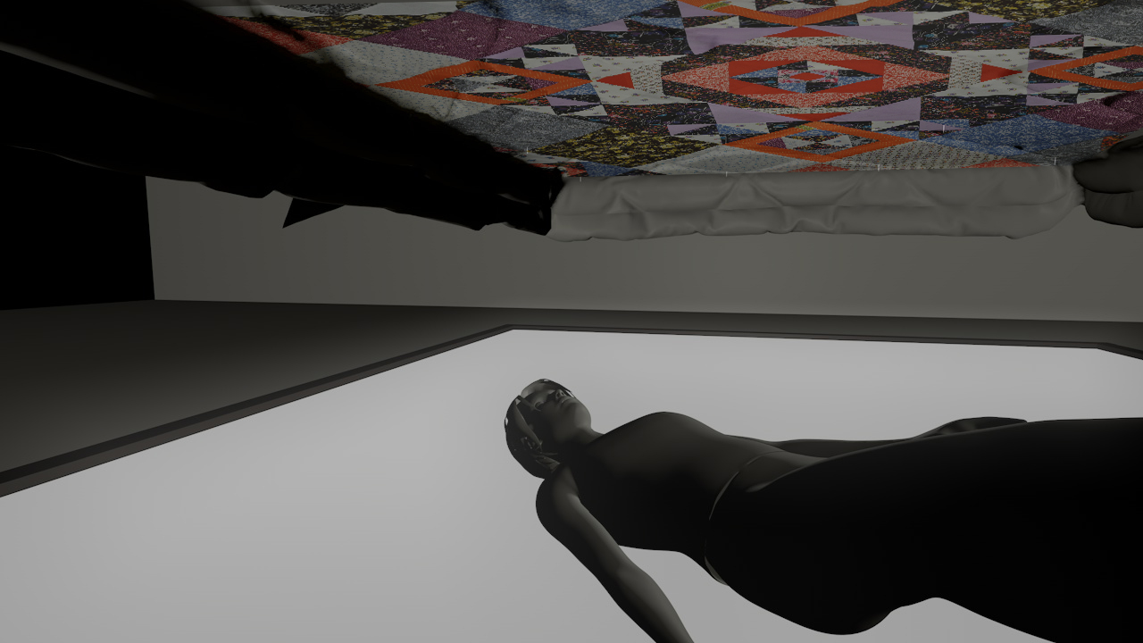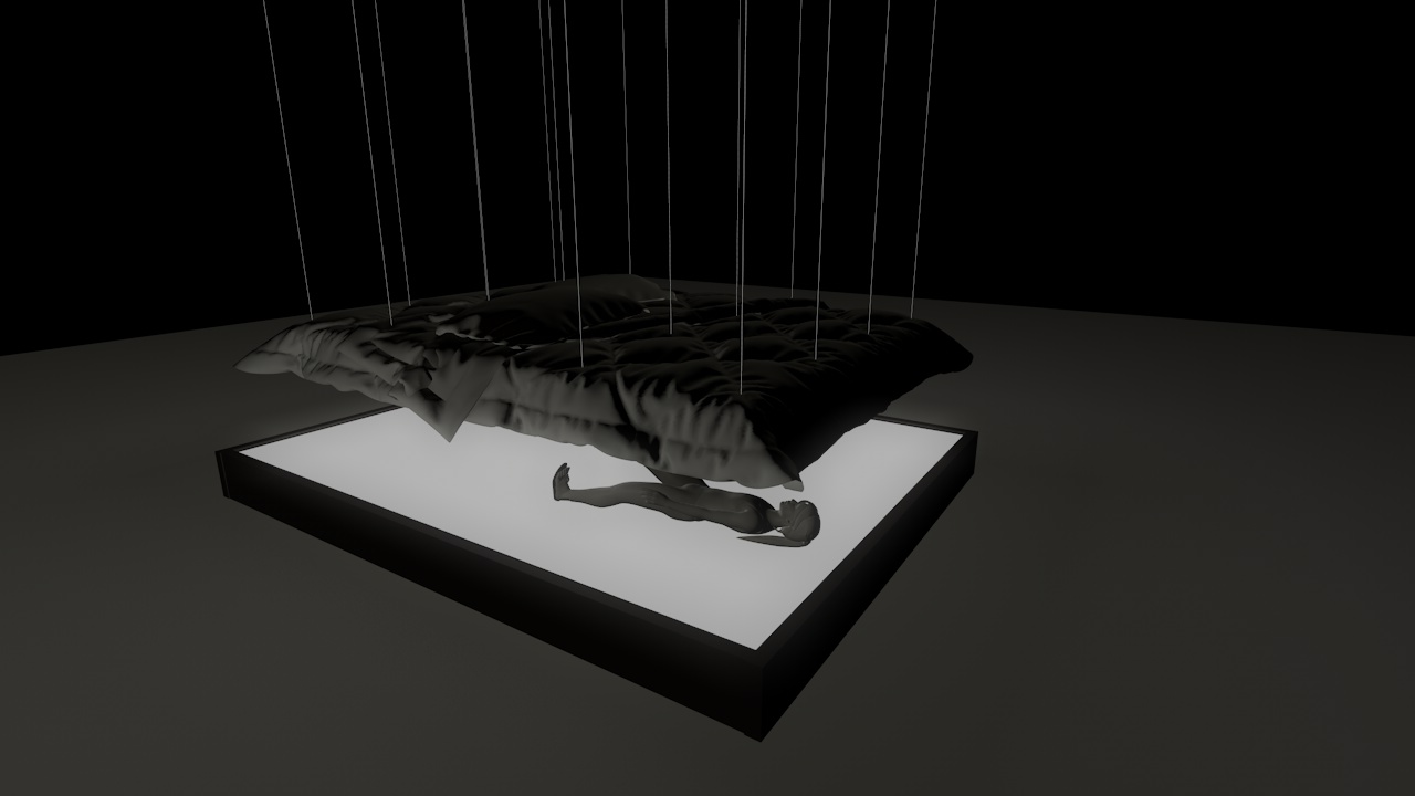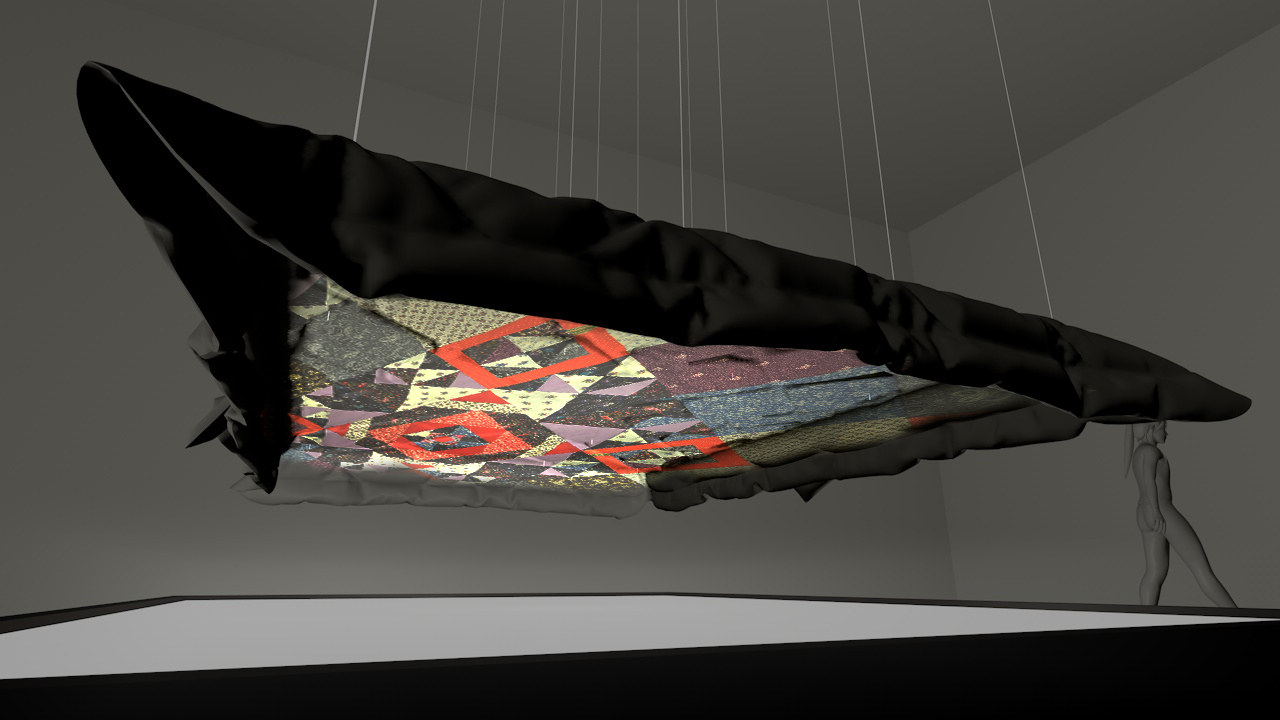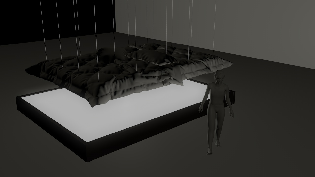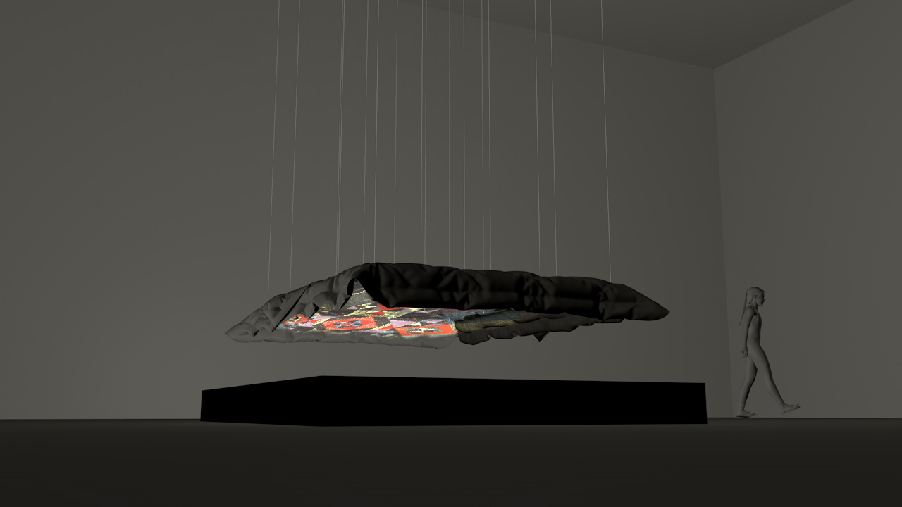 Инсталляция — одеяло подвешенное на тросах над световым подиумом. У зрителя есть возможно лечь на подиум, тогда он сможет рассмотреть рисунок на нижней части объекта.