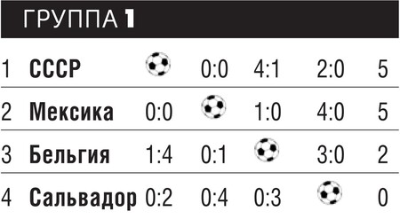 Команда хозяев первенства и сборная СССР неожиданно легко продвинулись в четвертьфинал. Бельгийцы не смогли составить конкуренцию фаворитам, а от дебютантов из Сальвадора подвоха не ожидали. Так и случилось. Матч открытия между командами Мексики и СССР по сложившейся традиции завершился нулевой ничьей. Опасных моментов соперники создали не так много, зато преуспели в грубости. Первым в истории чемпионатов мира игроком, получившим желтую карточку, стал советский полузащитник Кахи Асатиани. Во втором туре сборная СССР разгромила со счетом 4:1 бельгийцев. Два гола записал на свой счет нападающий киевского «Динамо» Анатолий Бышовец, который отличился дублем и в последнем матче с Сальвадором — 2:0. Сборные СССР и Мексики завершили турнир с одинаковыми показателями, поэтому итоговые места пришлось определять жребием. На специальной церемонии в отеле «Мария Изабель» нападающий Валерий Поркуян вытянул бумажку с номером «1», обеспечив советской команде встречу в четвертьфинале со сборной Уругвая.