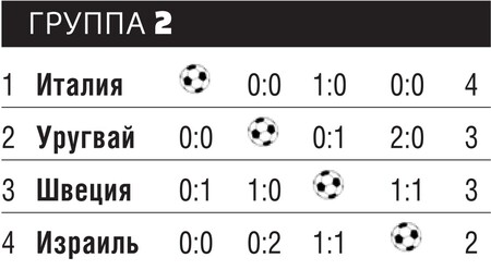 Столь же скучно прокладывала себе дорогу в четвертьфинал сборная Уругвая. В актив двукратным чемпионам можно было занести лишь ничейный результат с итальянцами. Обе команды все 90 минут как зеницу ока оберегали собственные ворота, за что и удостоились мощного свиста с трибун. Шведы уже во втором туре заметно сократили свои шансы ничьей с Израилем, зато в решающем матче с Уругваем сделали все возможное для победы. Дважды южноамериканцев спасала штанга, несколько раз — судья, не замечавший грубого обращения со скандинавскими игроками. Наконец, на 90-й минуте гол забил Гран, но этого оказалось мало. Для выхода в четвертьфинал шведам нужен был еще один мяч, а вот времени на то, чтобы его забить, не осталось.