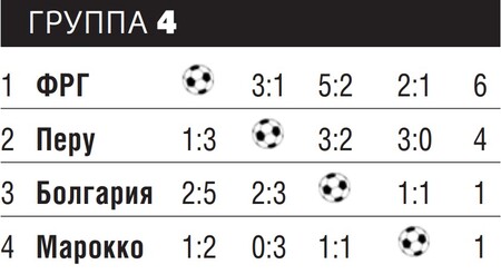 Вице-чемпион мира, сборная ФРГ, считалась явным фаворитом в группе, тем более что в ее составе за четыре года произошло не так много изменений. Главное — появился забивной форвард Герд Мюллер, который спас команду от позора в первом же матче с Марокко. Пропустив гол от новичков мирового первенства в середине первого тайма, немцы неожиданно потеряли нить игры, засуетились, сбились на долгий розыгрыш мяча, забыли о тренерских инструкциях. Через полчаса опытный Зеелер все же сумел вырваться из-под опеки и сравнял результат, а в конце, когда немцы играли уже в пять нападающих, отличился Мюллер. Он же стал автором трех мячей в ворота болгарской сборной, приехавшей в Мексику за первой победой. Казалось, что болгарские футболисты реализуют свою мечту в матче с Перу. Но волевая победа была одержана южноамериканцами, которым удалось отыграть два мяча. Победный гол забил Теофило Кубильяс — лучший бомбардир перуанцев на чемпионатах мира. На его счету 10 голов в двух розыгрышах (1970 и 1978 годов).