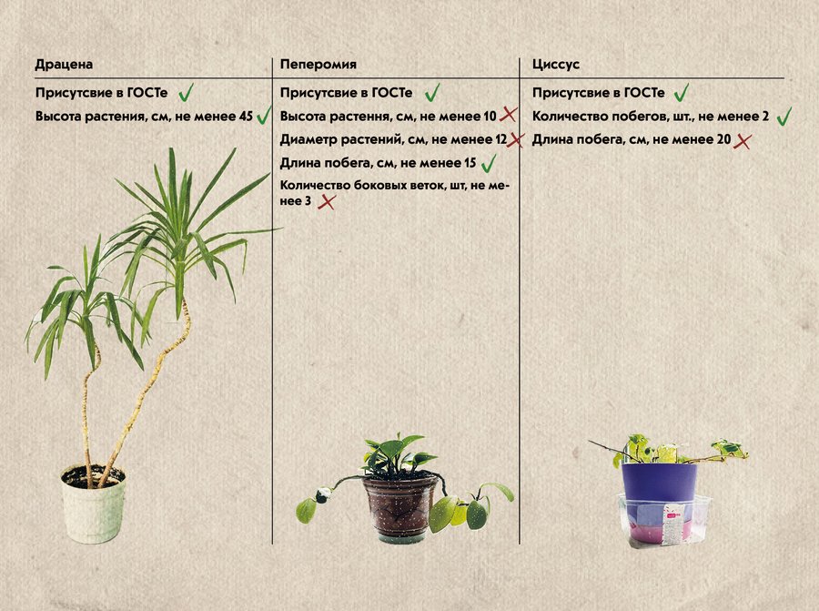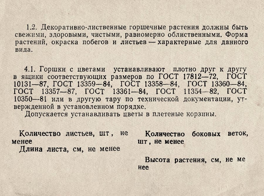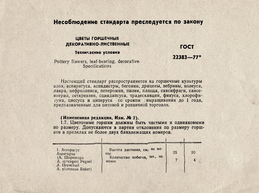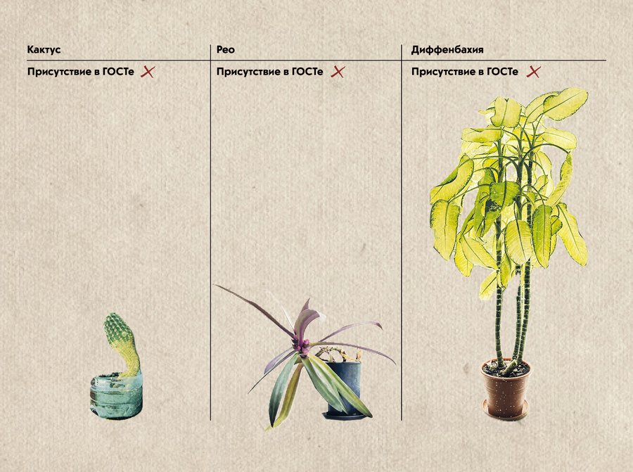 Государственные учреждения, например, поликлиники, закупают комнатные растения согласно ГОСТу-22383-77, который регламентирует параметры растений — рост, побеги, диаметр. Мое исследование показало, что на практике эти нормы не соблюдаются: большинство растений отклоняется от норм или в принципе отсутствует в ГОСТе. Как и растения, люди в современном обществе не поддаются стандартизации, представляя собой бесчисленное множество многообразных идентичностей.