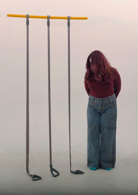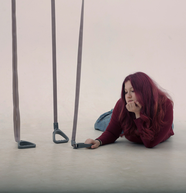Работа «Не за что» представляет собой несколько ременных поручней, используемых в общественном транспорте, но сильно удлинённых — они спускаются до самого пола, превращаясь в нечто избыточное, абсурдное. Их длина делает их бесполезными. Поручни — основа опоры, стабильности — здесь отражают крах привычных систем поддержки. Упорядоченные структуры трансформируются в хаос: то, что должно организовывать пространство и движение, теперь лишь создаёт абсурдный визуальный и функциональный дисбаланс.