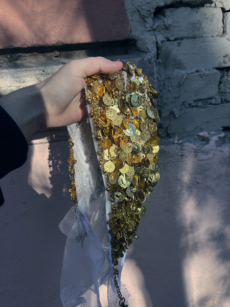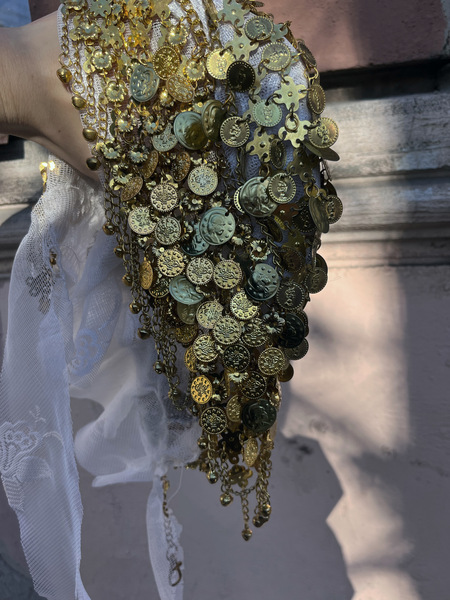 Материалы: кружевной тюль, символизирующий изящество, зыбкость, «женскую» красоту искусства и золотой звенящий монисто, напротив, передающий дерзкое, бунтующее и вызывающее настроение художественного движения