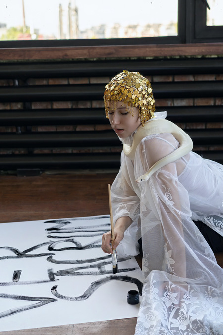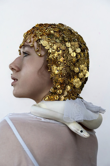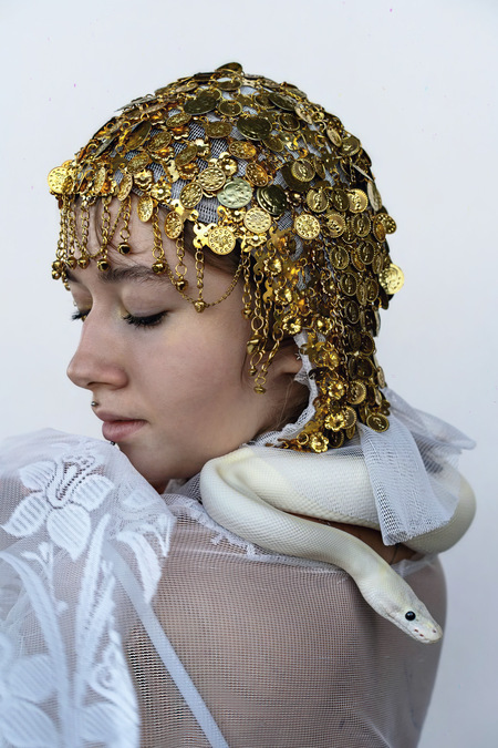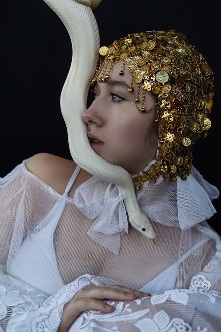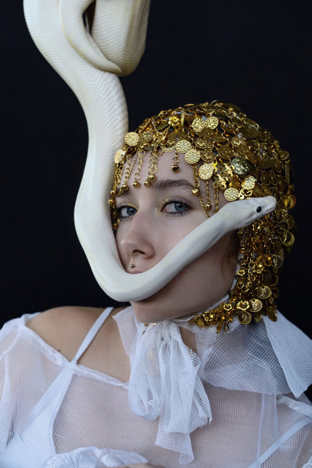 Белый «мраморный» питон помогает воссоздать образ одного из символов сецессиона — покровительницы воинов — Афины Паллады, священным животным которой являлась змея.