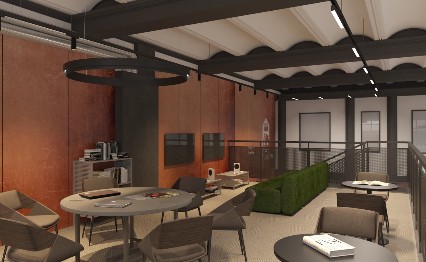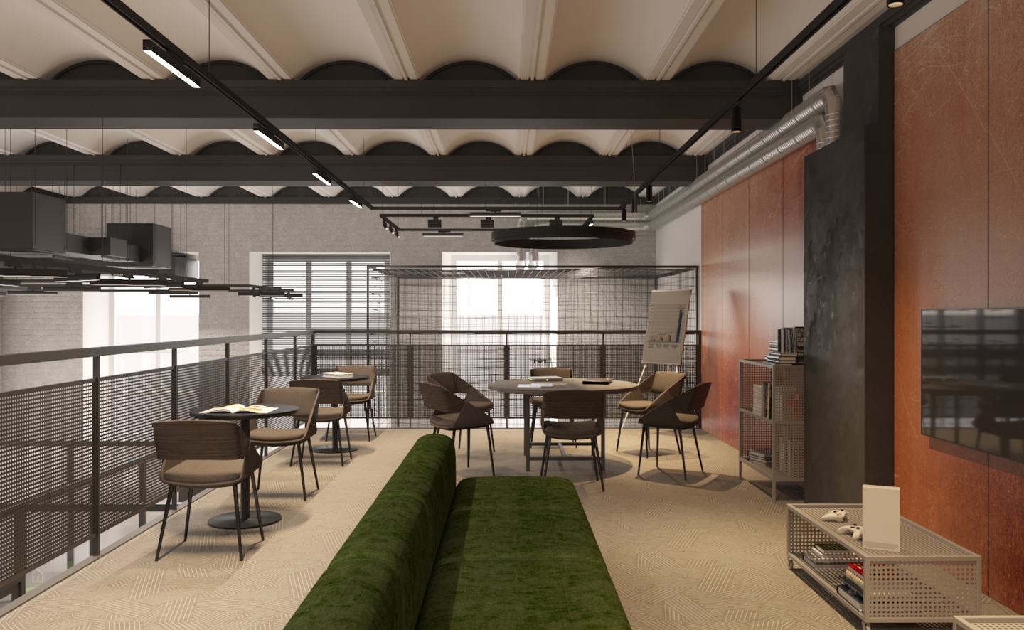 На антресоли предусмотрена зона для отдыха и общения. В качестве одного из отделочных материалов предложены панели с отделкой «под медь», чтобы с одной стороны проявить историчность среды, а с другой подчеркнуть её современное, технологическое назначение. Контрастная покраска сводов Монье и ригелей потолка также выявляет их объём.