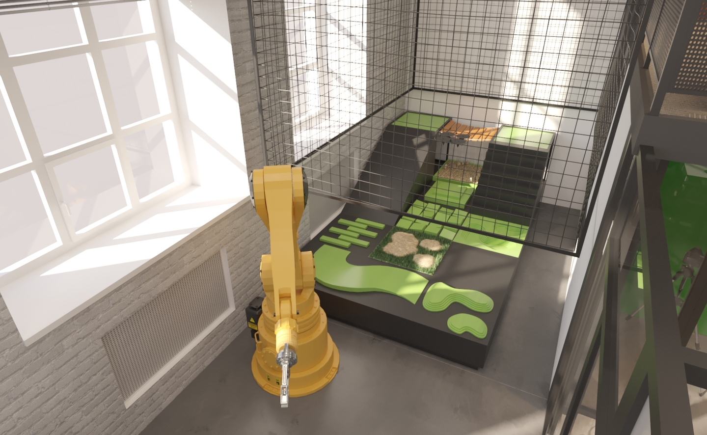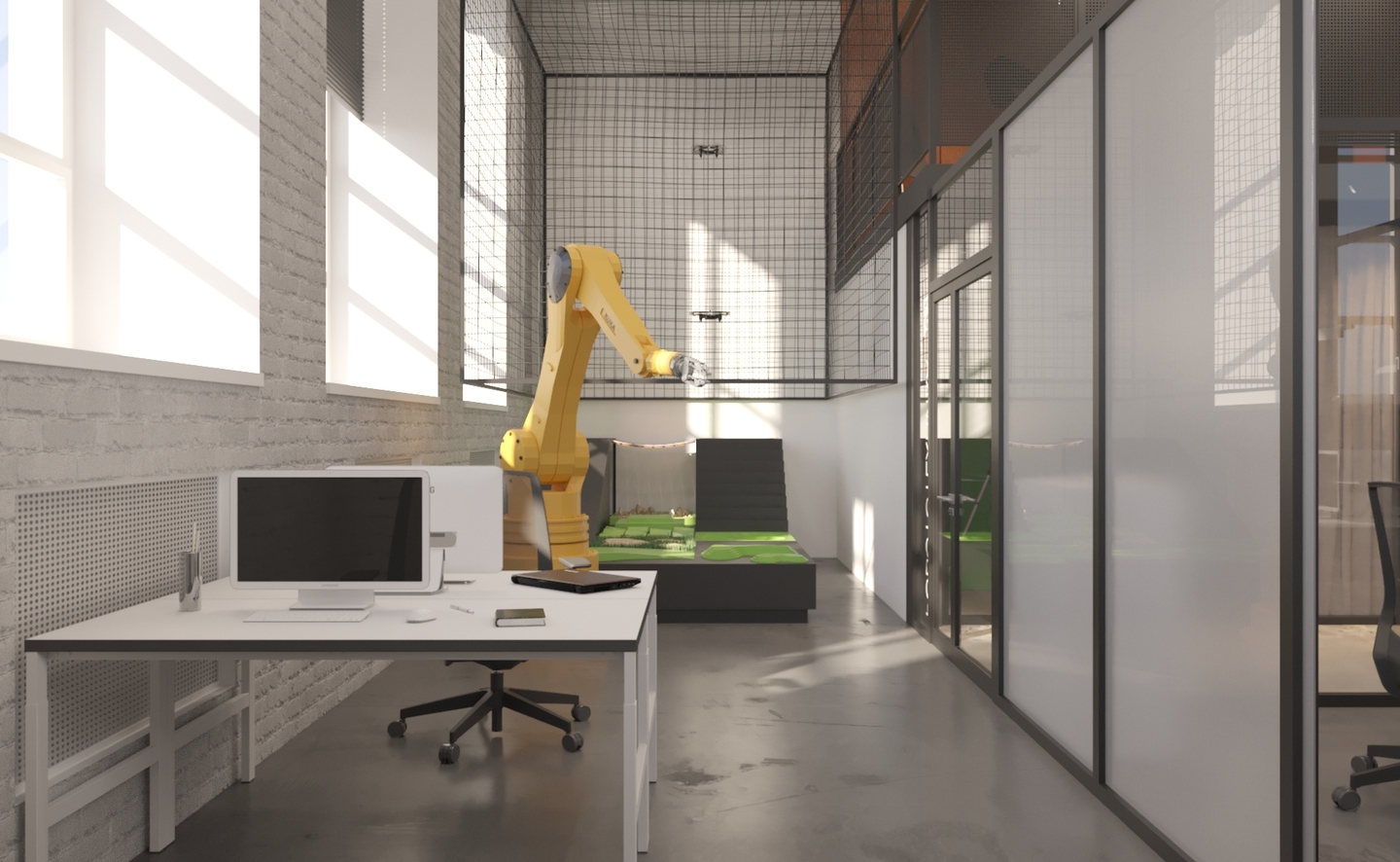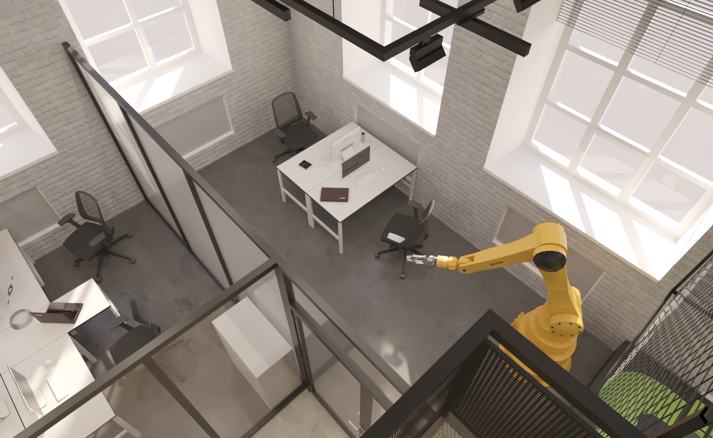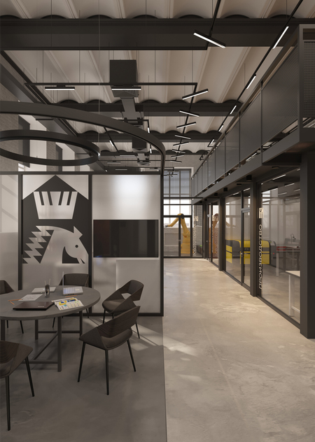 Центральный коридор служит главной «артерией» помещения — слева от него расположились переговорная и проектный кластер. Справа, под антресолью — производственная зона и фотостудия. В торце помещения, в двусветном пространстве, находится зона робототехники с полигоном для испытания роботов и производственным манипулятором.