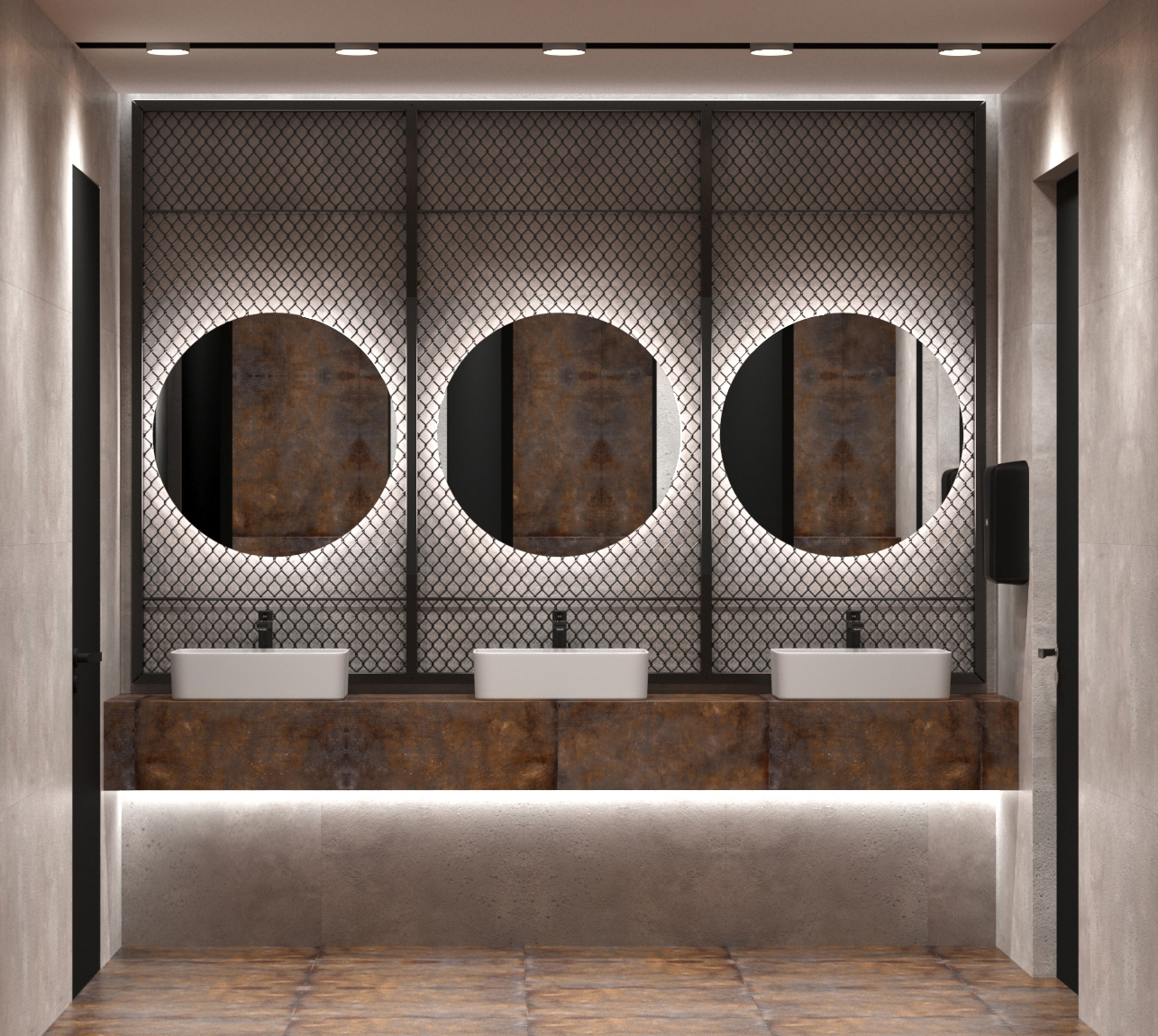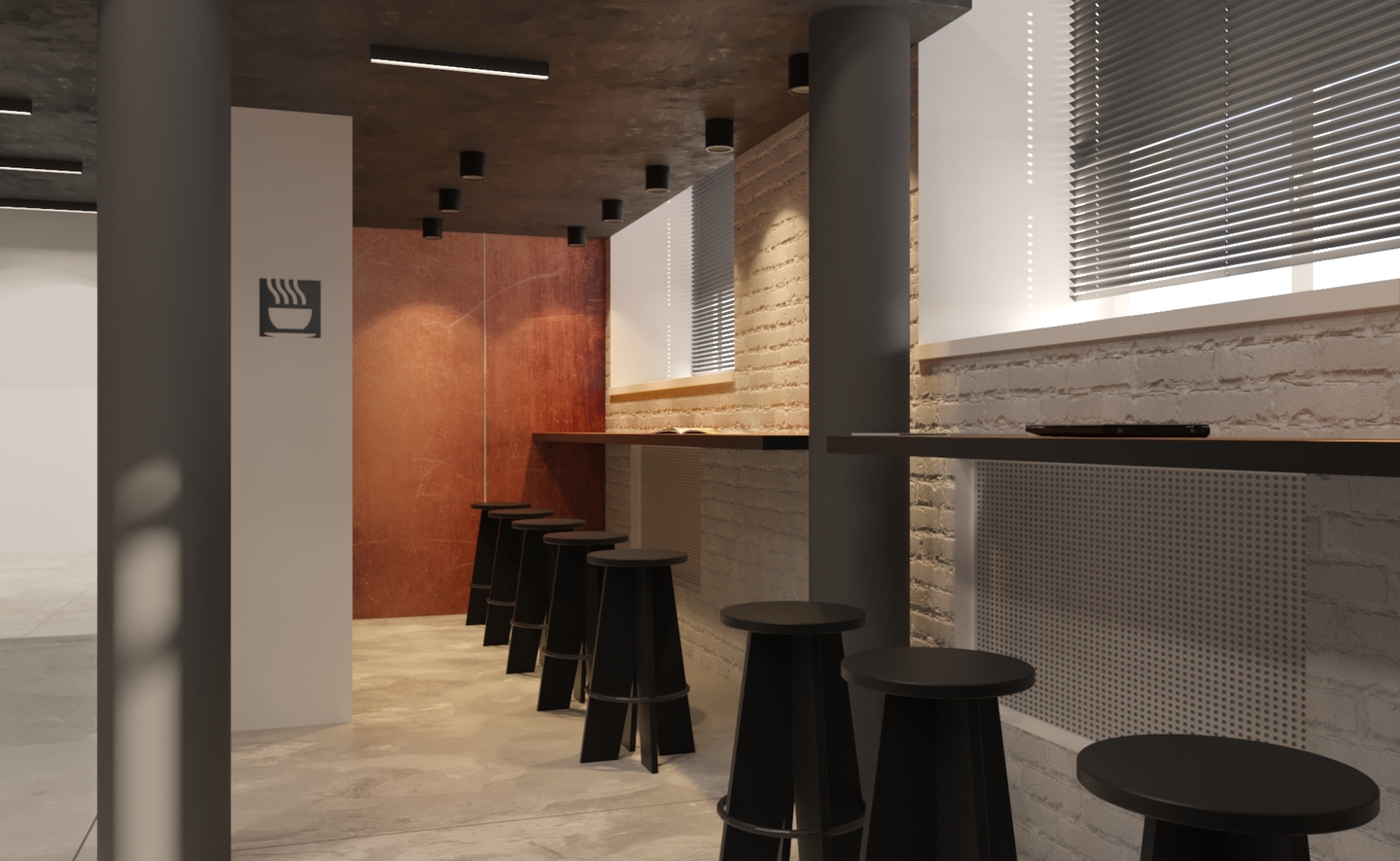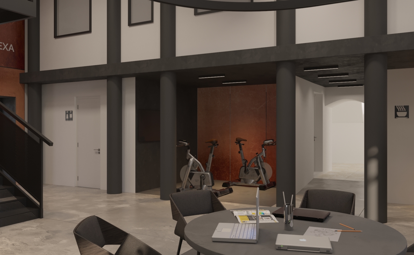 Над главным входом в помещение коворкинга расположена ещё одна антресоль, уже не предназначенная для посетителей. Под ней — барная стойка, небольшое пространство с тренажёрами, и туалеты, также оформленные в индустриальном стиле.