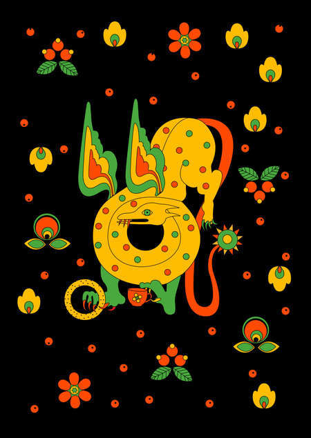 серия иллюстраций для календаря совмещает китайских драконов и народные росписи: хохломскую, гжельскую и городецкую