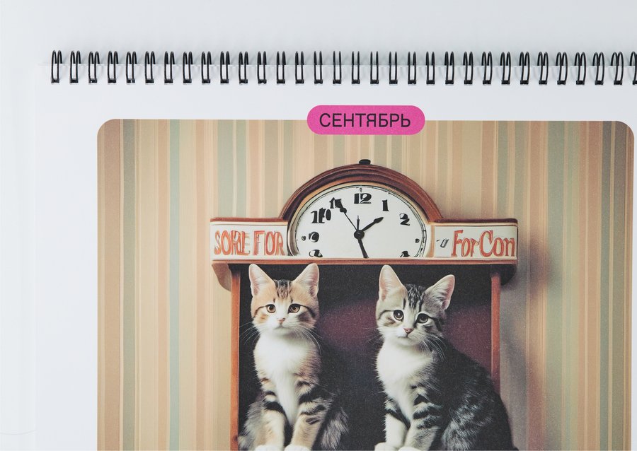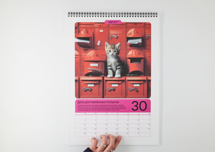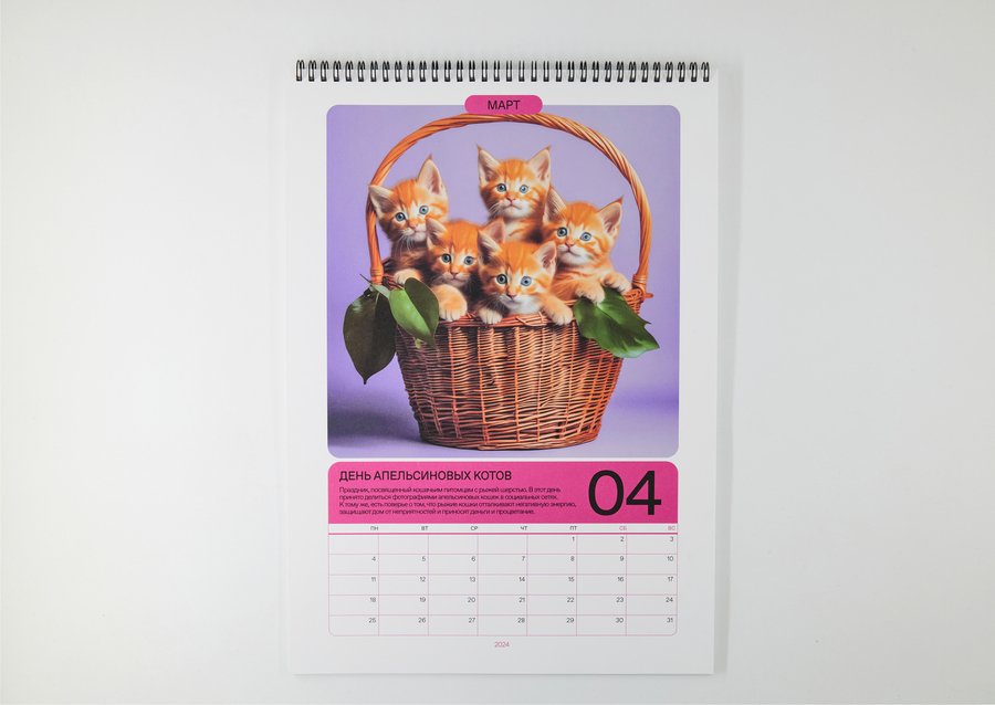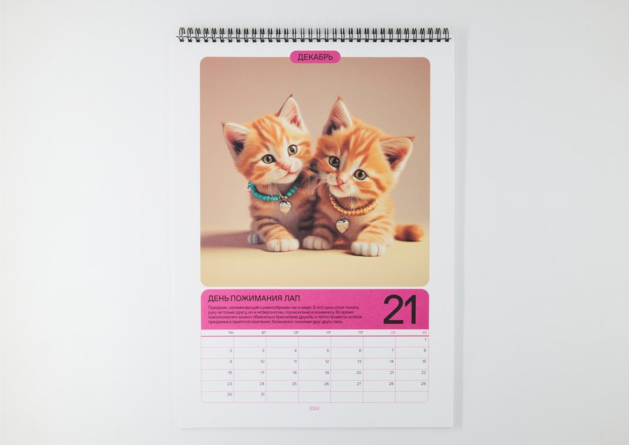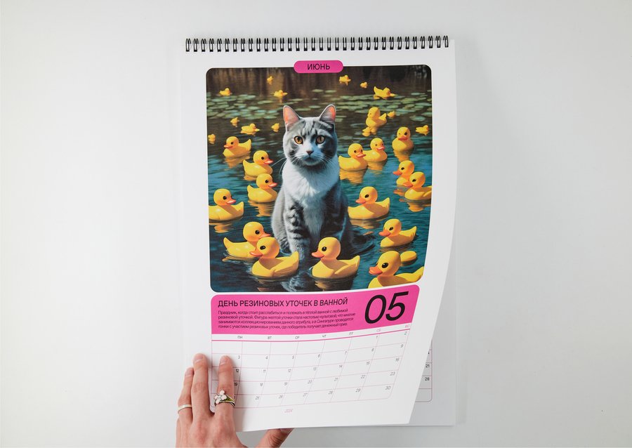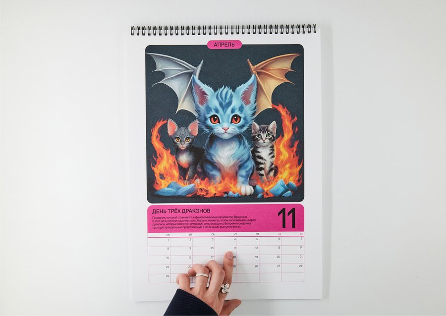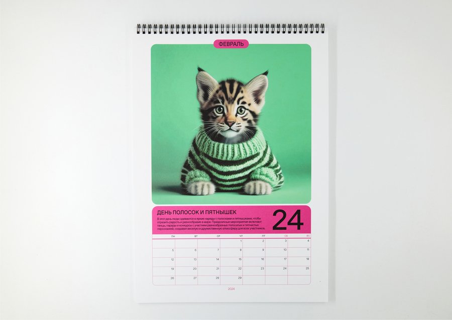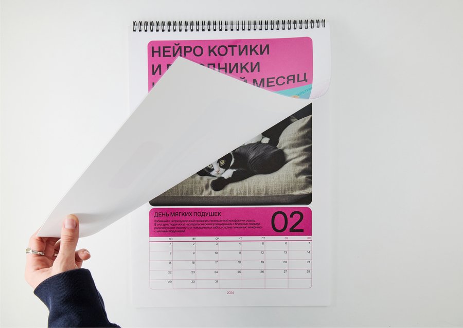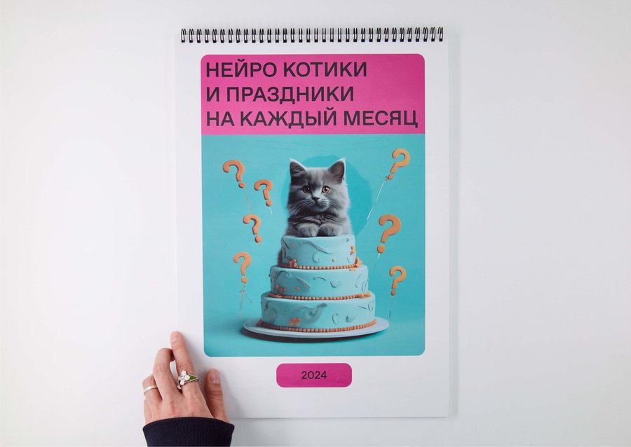 «Нейро котики и праздники на каждый месяц» — календарь на 2024 год. Каждый месяц посвящён забавному доброму празднику. Сопровождающие разворот изображения были сгенерированы с помощью Stable Diffusion, с учётом особенностей праздника.