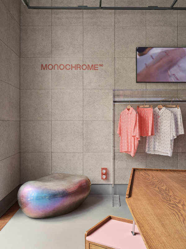 Основной идеей было создать яркое концептуальное пространство, которое отразит характер бренда, при этом показать архитектурными решениями уникальную уральскую айдентику со своей историей. Уральской айдентикой тут мы решили обозначить свердловский конструктивизм и обратились к нему за вдохновением. Играя в конструктивизм, мы аскетично подошли к выбору отделочных материалов. Все стены отделаны древесными акустическими панелями серого цвета — это визуально эффектный материал, простой в монтаже и эксплуатации. Пол и потолок оставили «без отделки», в бетоне.