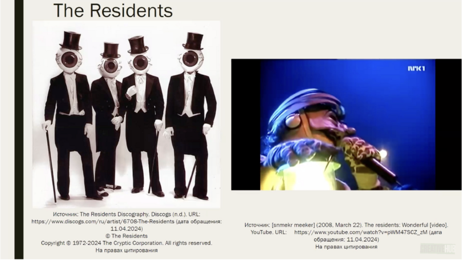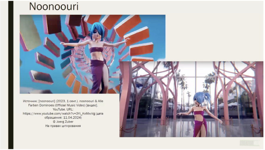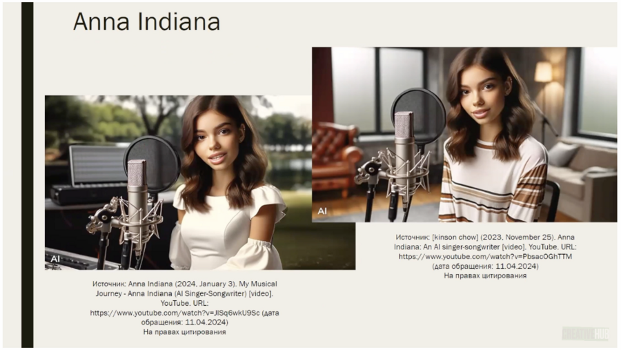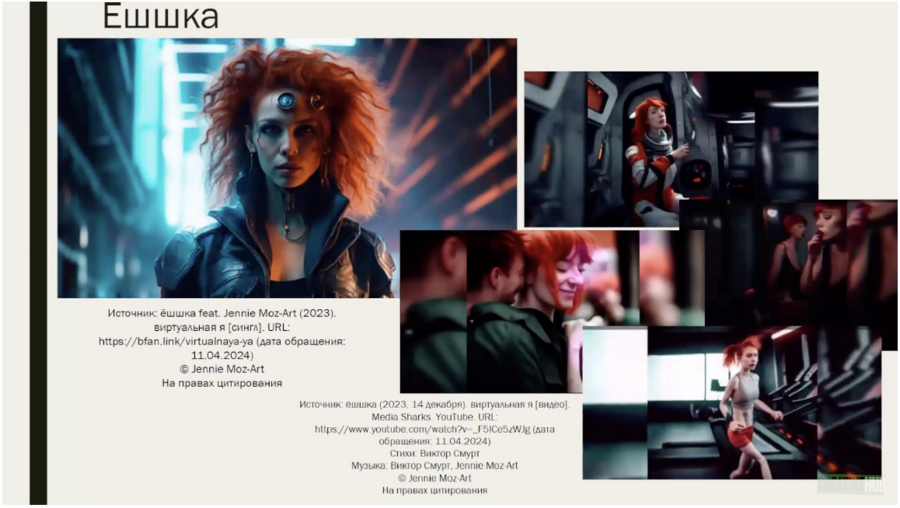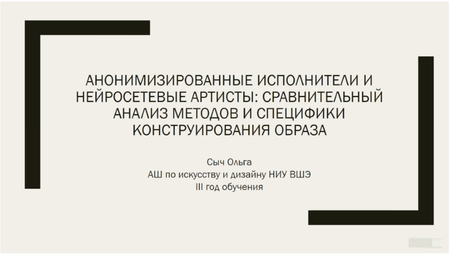В своём докладе «Анонимизированные исполнители и нейросетевые артисты: сравнительный анализ методов и специфики конструирования образа» аспирантка Аспирантской школы по искусству и дизайну НИУ ВШЭ Ольга Сыч рассказала о принципах построения имиджа артиста для виртуальных образов музыкальной группы Gorillaz и полностью виртуальных артистов, созданных батареей нейросетей, таких, как Anna Indiana и ёшшка.