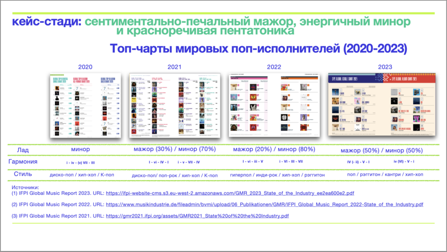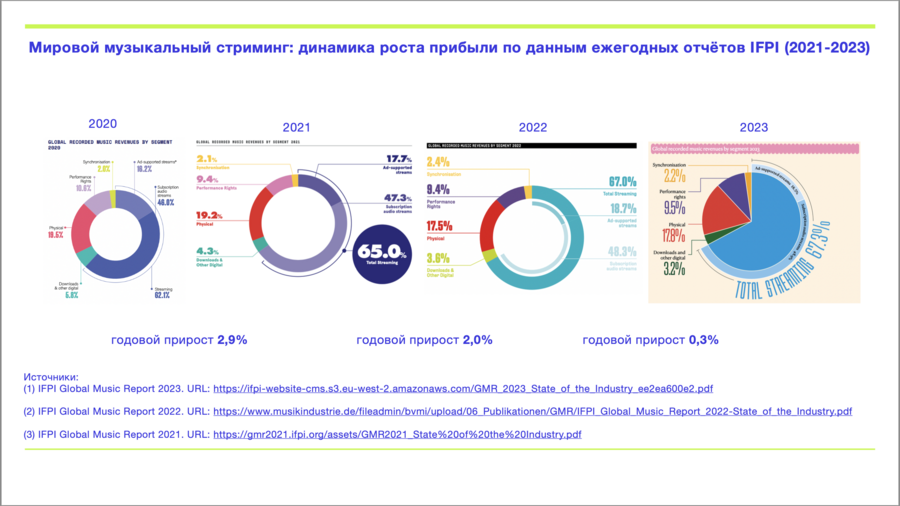 подробнее: Евгения Евпак. Цифровизация музыкальной индустрии: оценка динамики изменений в сегменте стриминга (2021–2023 гг.) с внедрением продуктов генеративной музыки. // III Международный форум молодых исследователей креативной экономики НИУ ВШЭ, 17 ноября 2023 г., тайм-коды: 01:06:30 — 01:15:52.
