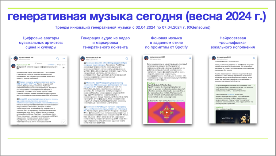 Адресуя вопрос о состоянии музыкального стриминга музыкальному менеджеру и создателю телеграмм-каналов misha’s tips о музыкальном стриминге и «Музыкальный ИИ» (@gensound) Михаилу Мазунову, Евгения отметила, что удельный вес доходов от стриминга в музыкальную индустрию к 2023 г. вырос до 67%, и процитировала посты телеграмм-канала GenSound об апрельских трендах в развитии музыкальных нейросетей.